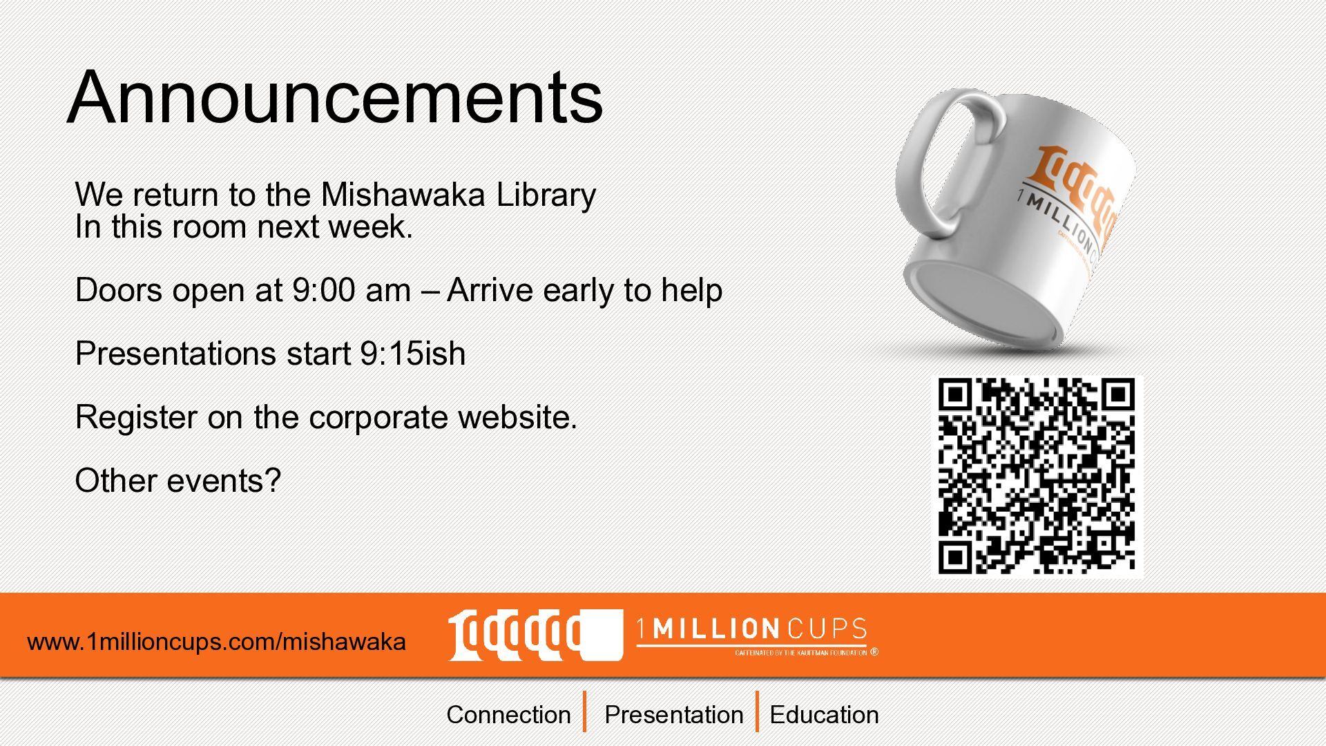 9. Connection | Presentation | Education Announcements www.1millioncups.com/mishawaka We return to
