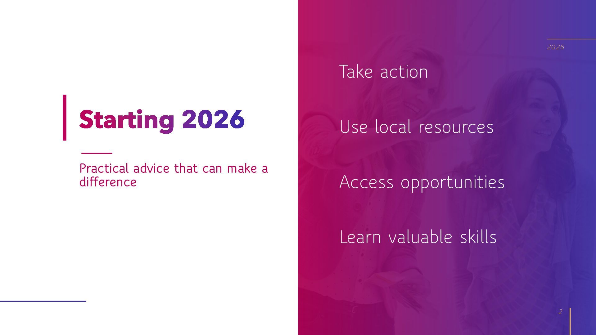 1. Starting 2026 Take action Use local resources Access opportunities Learn