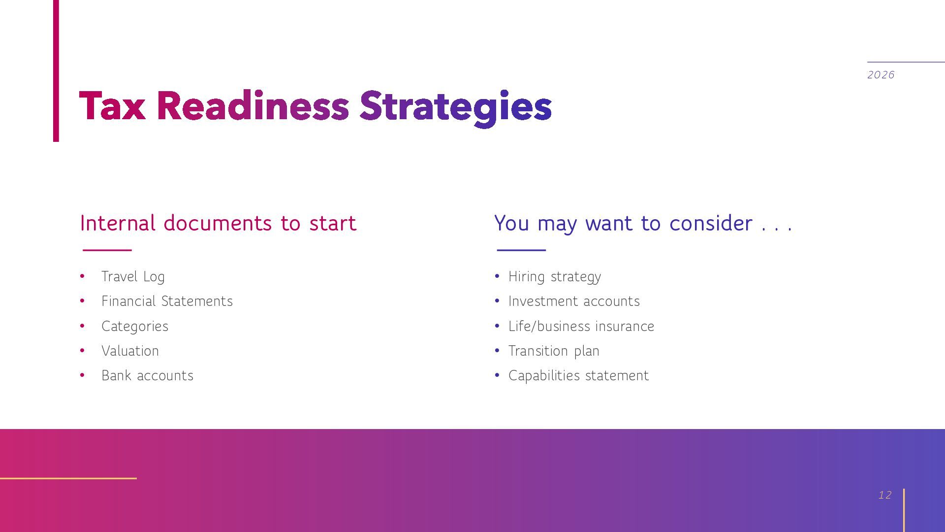 • Financial Statements • Categories • Valuation • Bank accounts You may want to consider . . . • Hiring strategy • Investment accounts • Life/business insurance • Transition plan • Capabilities statement 12 2026