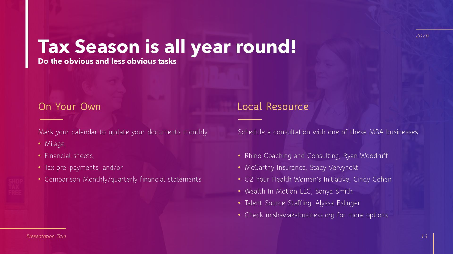 less obvious tasks On Your Own Mark your calendar to update your documents monthly • Milage, • Financial sheets, • Tax pre-payments, and/or • Comparison Monthly/quarterly financial statements Local Resource Presentation Title 13 2026 Schedule a consultation with one of these MBA businesses: • Rhino Coaching and Consulting, Ryan Woodruff • McCarthy Insurance, Stacy Vervynckt • C2 Your Health Women’s Initiative, Cindy Cohen • Wealth In Motion LLC, Sonya Smith • Talent Source Staffing, Alyssa Eslinger • Check mishawakabusiness.org for more options