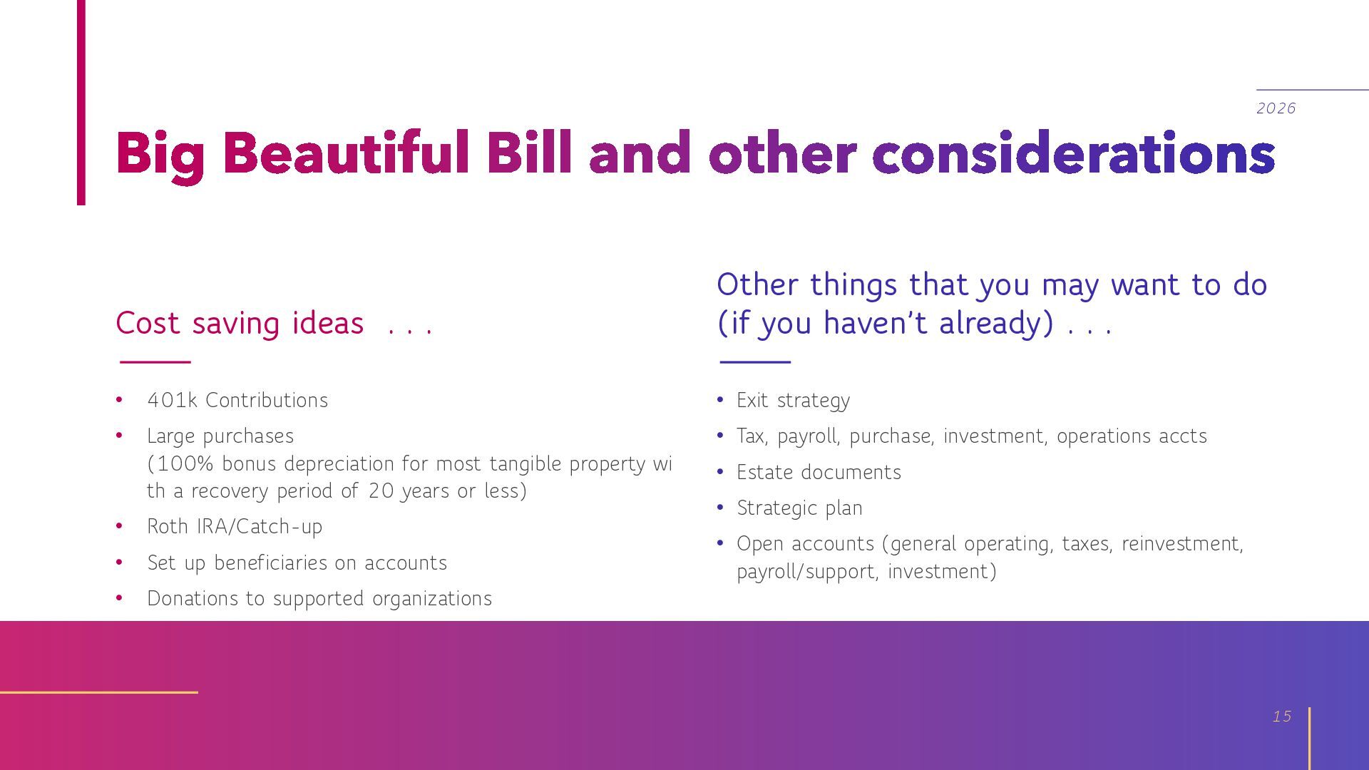 11. Big Beautiful Bill and other considerations Cost saving ideas .