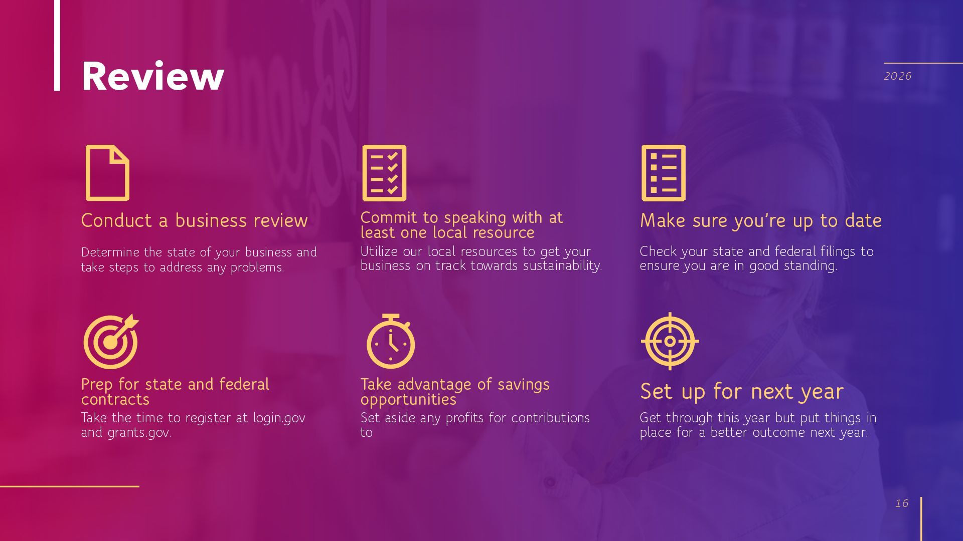 with at least one local resource Make sure you’re up to date Prep for state and federal contracts Take advantage of savings opportunities Set up for next year Determine the state of your business and take steps to address any problems. Utilize our local resources to get your business on track towards sustainability. Check your state and federal filings to ensure you are in good standing. Take the time to register at login.gov and grants.gov. Set aside any profits for contributions to Get through this year but put things in place for a better outcome next year.