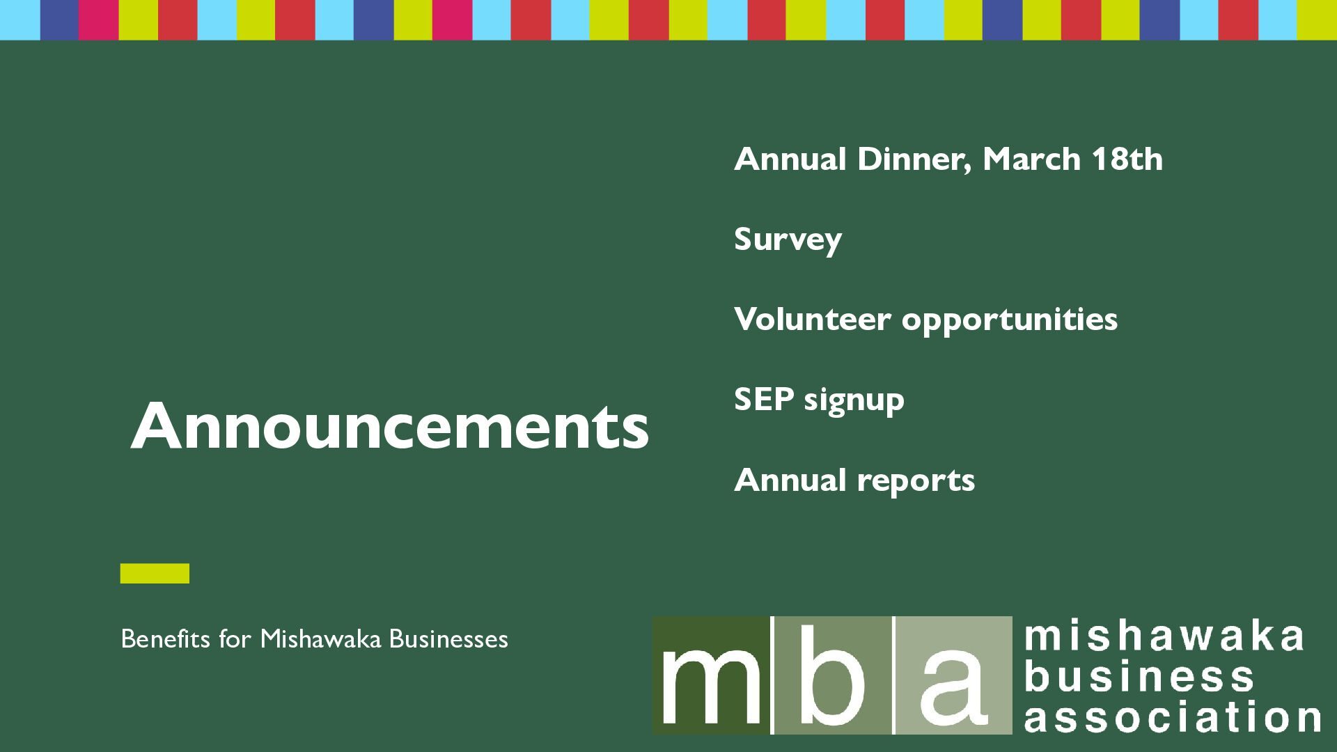 14. Benefits for Mishawaka Businesses Annual Dinner, March 18th Survey Volunteer