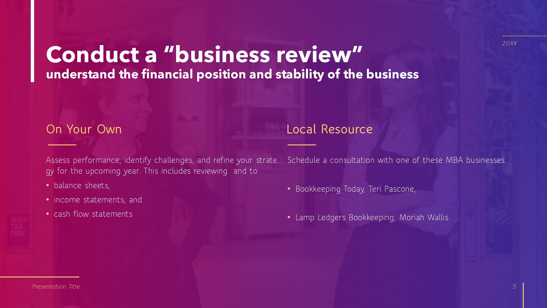 of the business On Your Own Assess performance, identify challenges, and refine your strate gy for the upcoming year. This includes reviewing and to • balance sheets, • income statements, and • cash flow statements Local Resource Presentation Title 5 20XX Schedule a consultation with one of these MBA businesses: • Bookkeeping Today, Teri Pascone, • Lamp Ledgers Bookkeeping, Moriah Wallis