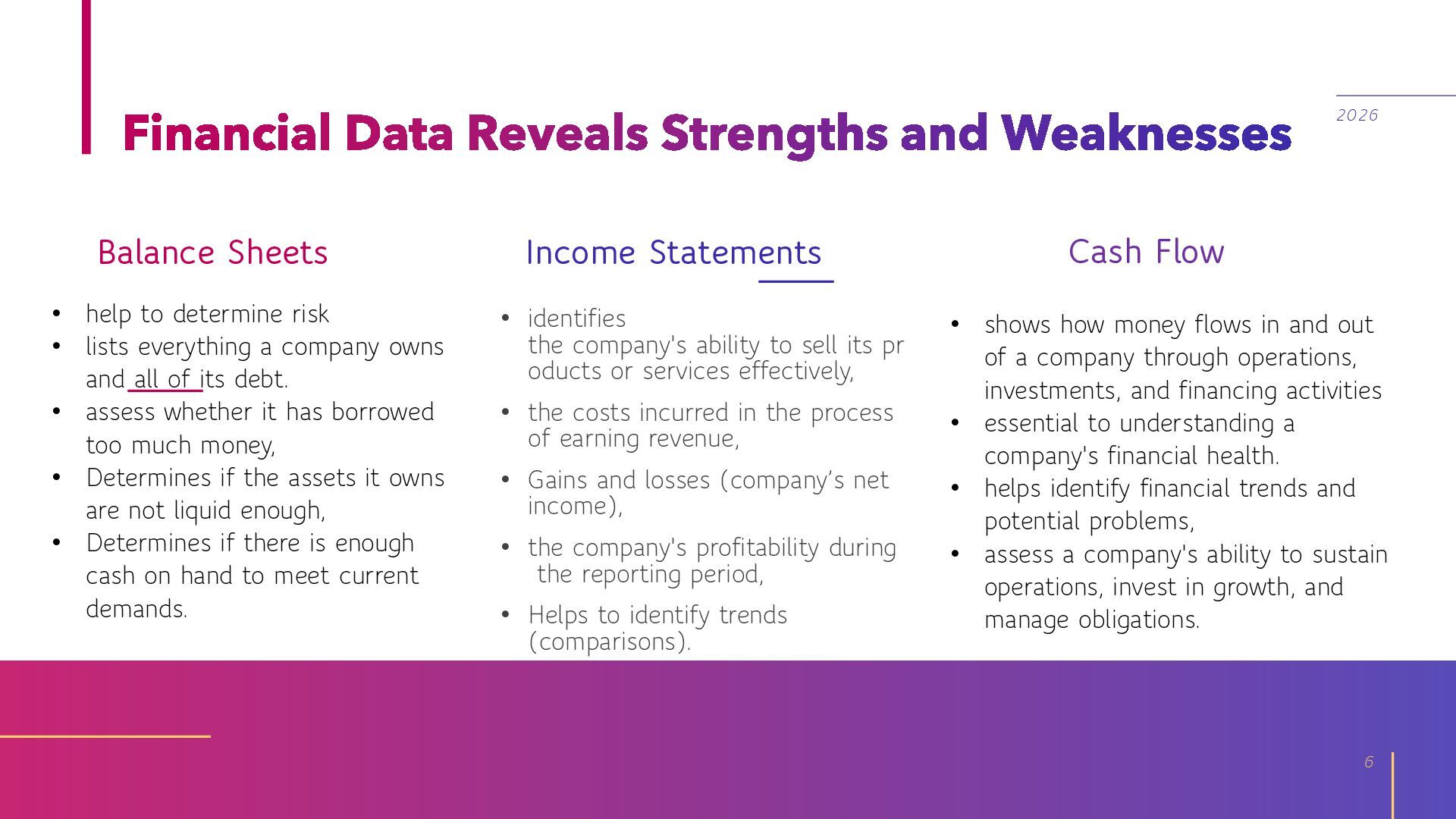 Statements • identifies the company's ability to sell its pr oducts or services effectively, • the costs incurred in the process of earning revenue, • Gains and losses (company’s net income), • the company's profitability during the reporting period, • Helps to identify trends (comparisons). 2026 Cash Flow • help to determine risk • lists everything a company owns and all of its debt. • assess whether it has borrowed too much money, • Determines if the assets it owns are not liquid enough, • Determines if there is enough cash on hand to meet current demands. • shows how money flows in and out of a company through operations, investments, and financing activities • essential to understanding a company's financial health. • helps identify financial trends and potential problems, • assess a company's ability to sustain operations, invest in growth, and manage obligations.