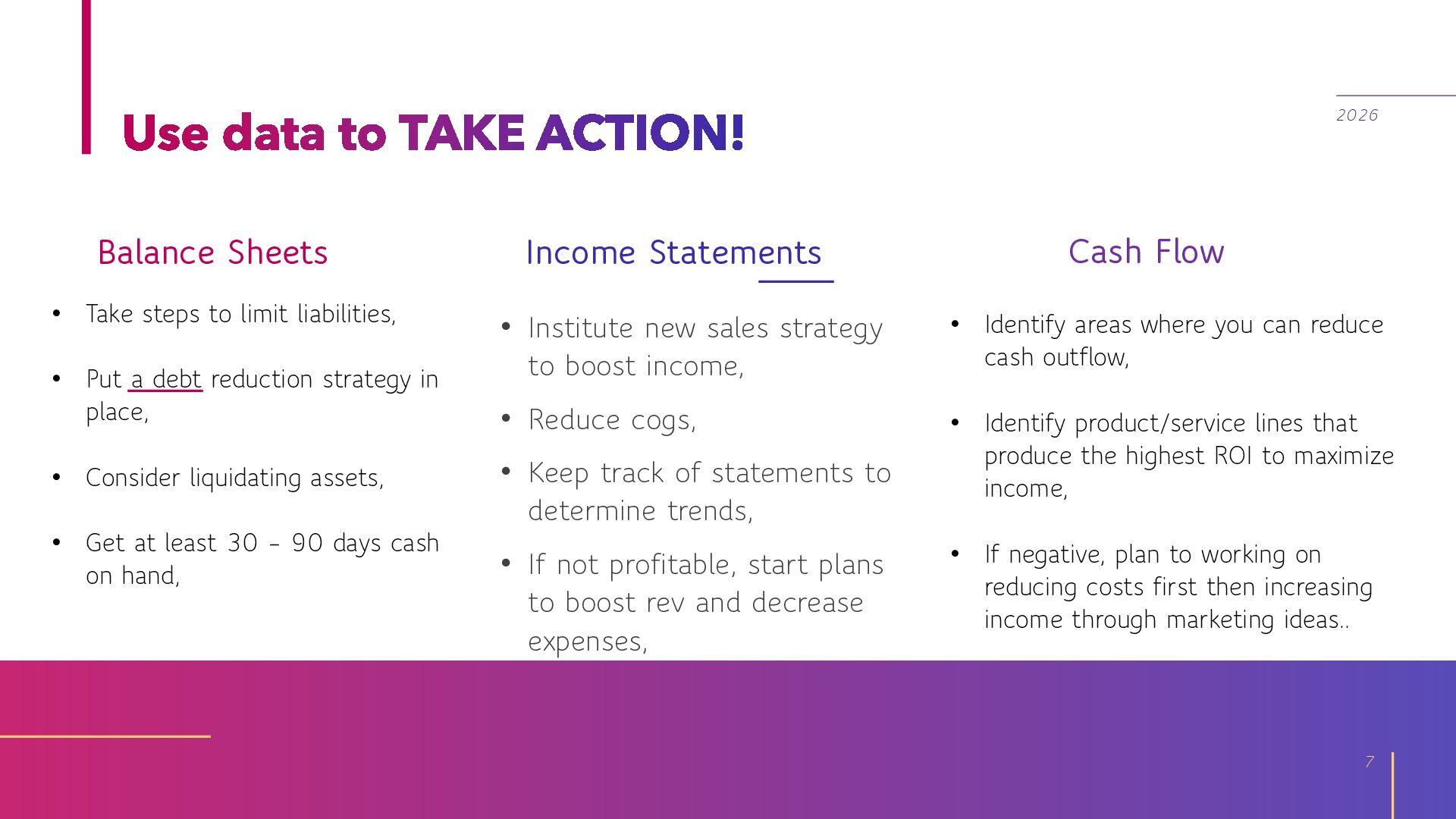 • Institute new sales strategy to boost income, • Reduce cogs, • Keep track of statements to determine trends, • If not profitable, start plans to boost rev and decrease expenses, 2026 Cash Flow • Take steps to limit liabilities, • Put a debt reduction strategy in place, • Consider liquidating assets, • Get at least 30 – 90 days cash on hand, • Identify areas where you can reduce cash outflow, • Identify product/service lines that produce the highest ROI to maximize income, • If negative, plan to working on reducing costs first then increasing income through marketing ideas..