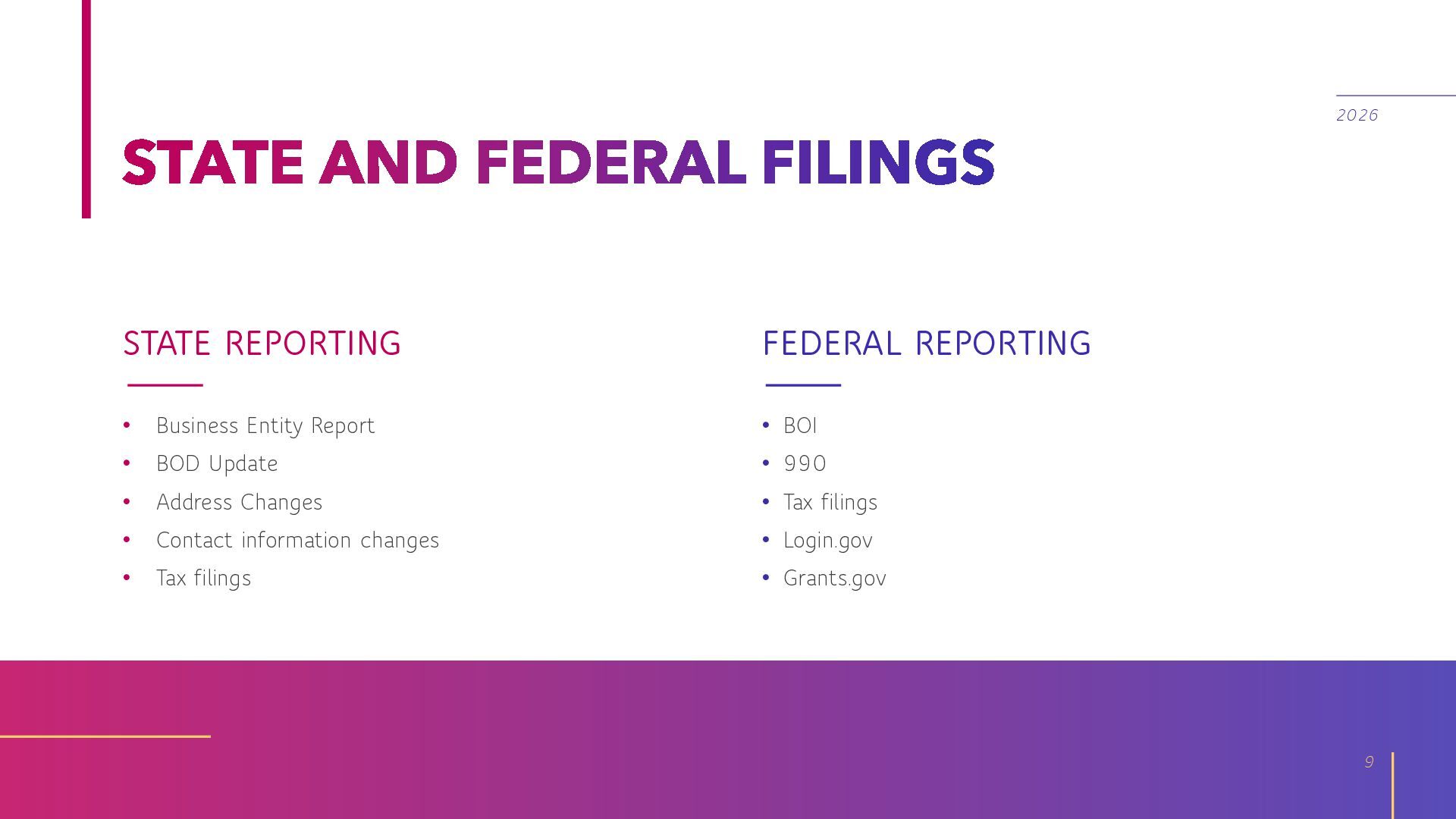 • BOD Update • Address Changes • Contact information changes • Tax filings FEDERAL REPORTING • BOI • 990 • Tax filings • Login.gov • Grants.gov 9 2026
