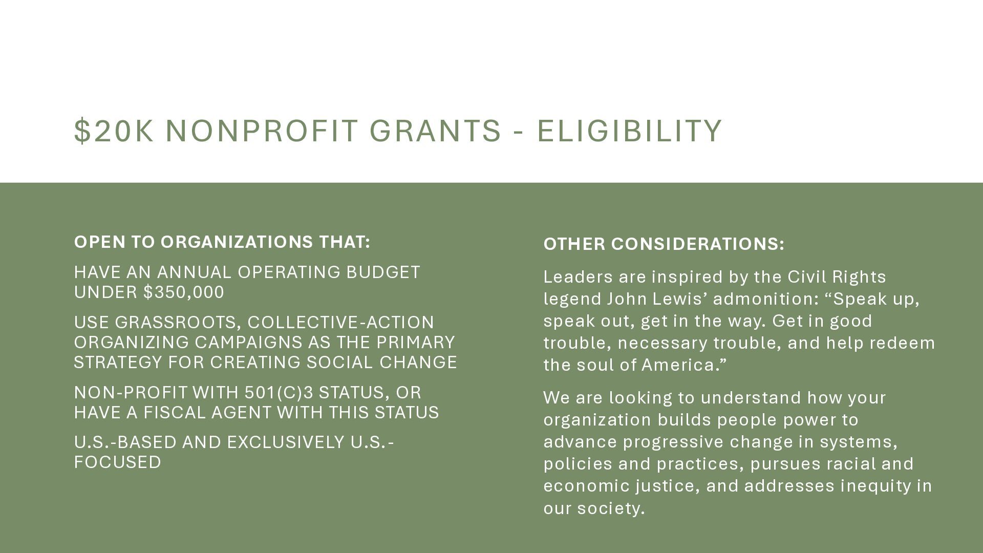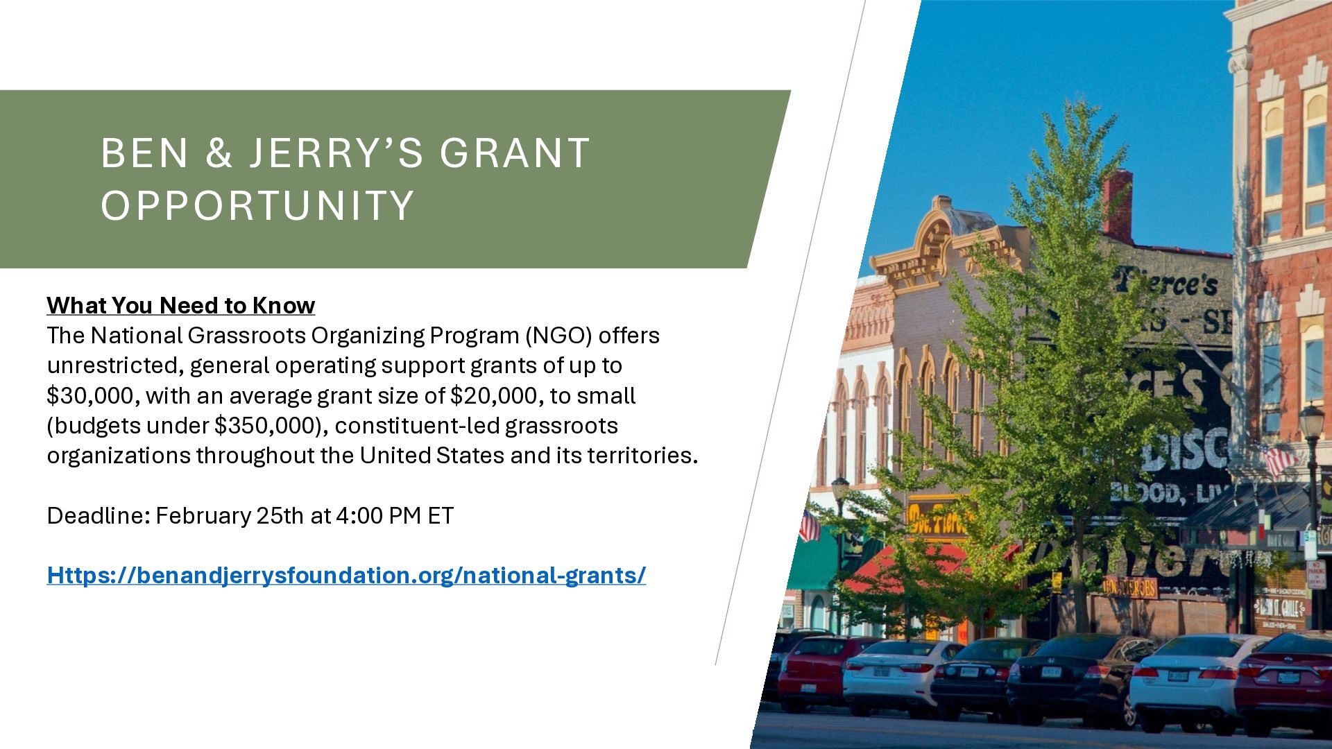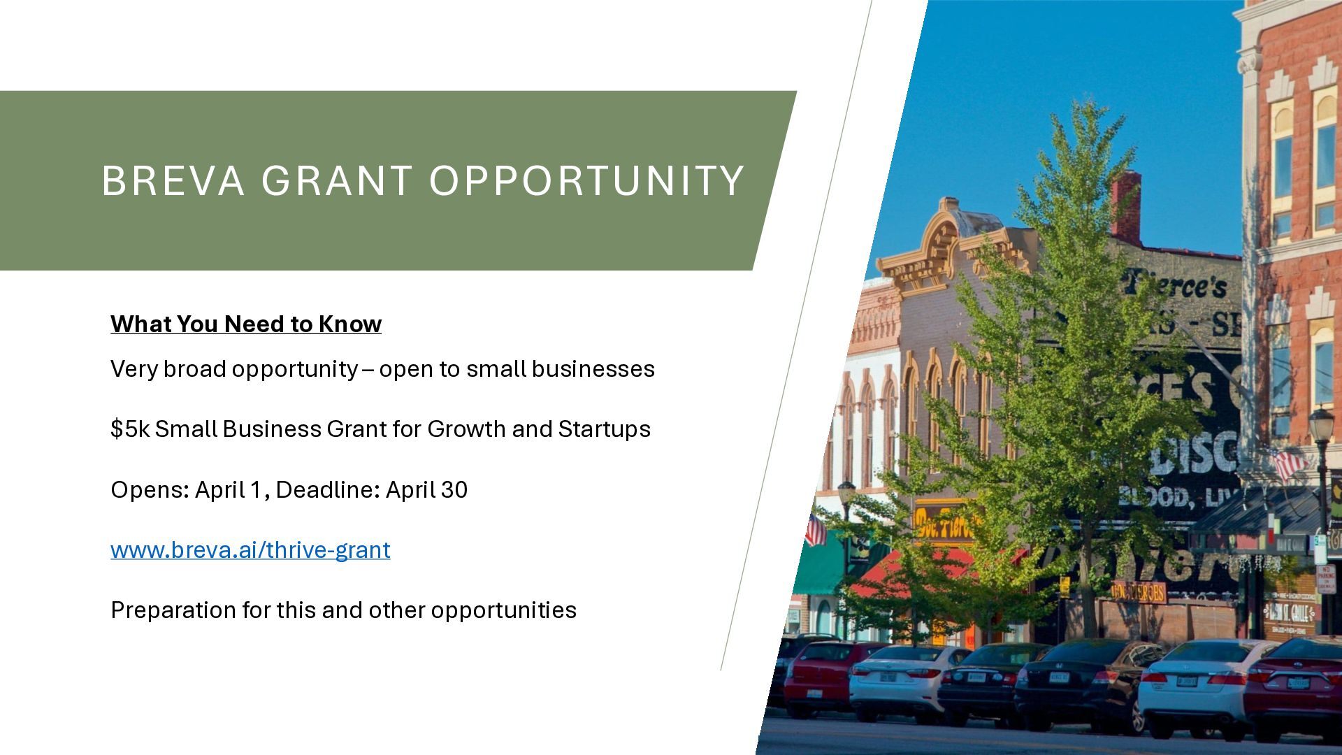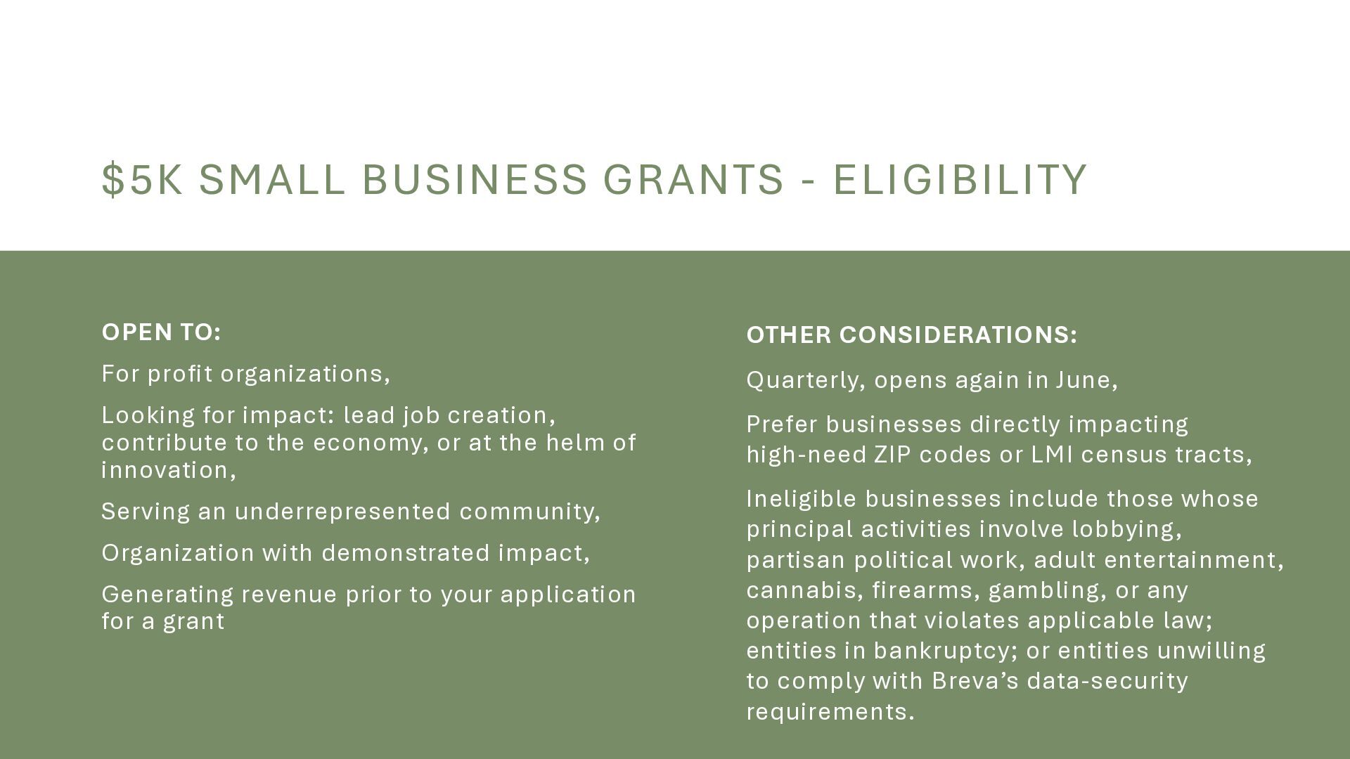 organizations, Looking for impact: lead job creation, contribute to the economy, or at the helm of innovation, Serving an underrepresented community, Organization with demonstrated impact, Generating revenue prior to your application for a grant OTHER CONSIDERATIONS: Quarterly, opens again in June, Prefer businesses directly impacting high-need ZIP codes or LMI census tracts, Ineligible businesses include those whose principal activities involve lobbying, partisan political work, adult entertainment, cannabis, firearms, gambling, or any operation that violates applicable law; entities in bankruptcy; or entities unwilling to comply with Breva’s data-security requirements.