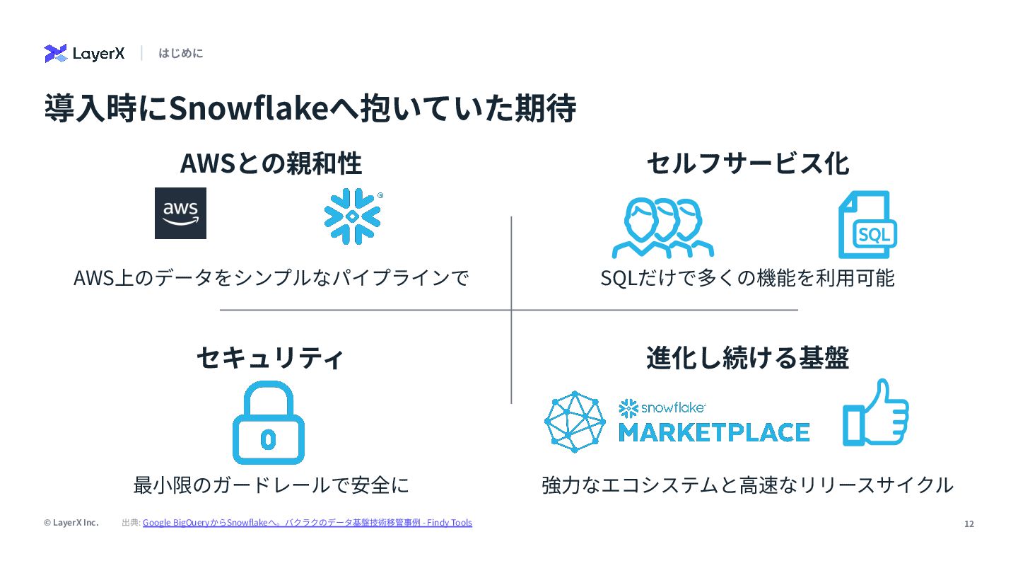 3. © LayerX Inc. 12 セキュリティ 導⼊時にSnowflakeへ抱いていた期待 AWSとの親和性 進化し続ける基盤 セルフサービス化 はじめに
