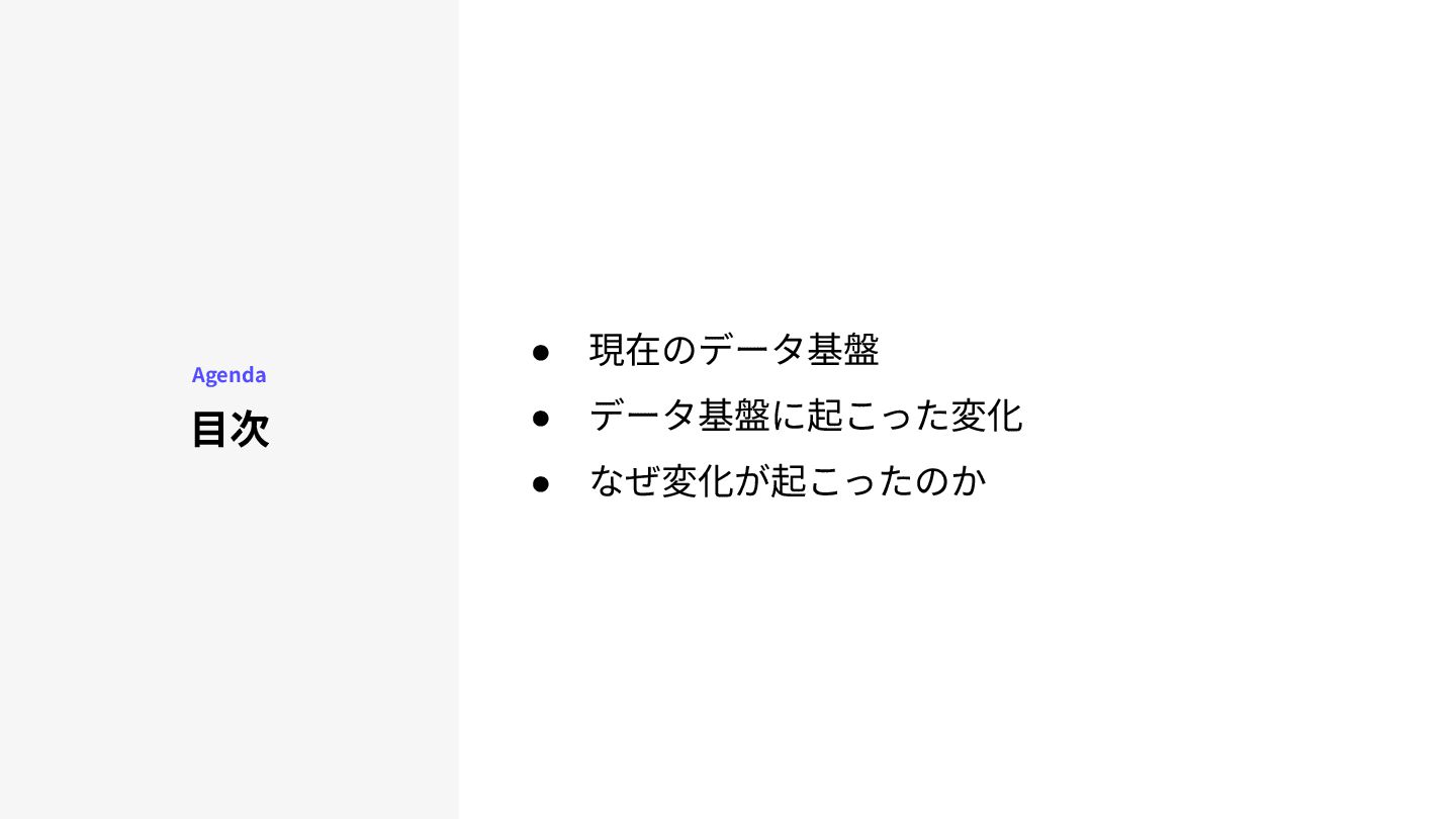 セルフサービス化の定着 エンジニア‧⾮エンジニア問わ ず、⾃発的にデータを使った施 策を実施できるように データプロダクトのリリース プロダクト機能としてデータ基盤が組み 込まれるように ビジネスプロセスへの組み込み データが分析の域を超え、営業‧CS‧契 約管理など⽇々の業務フローに組み込ま れるように はじめに