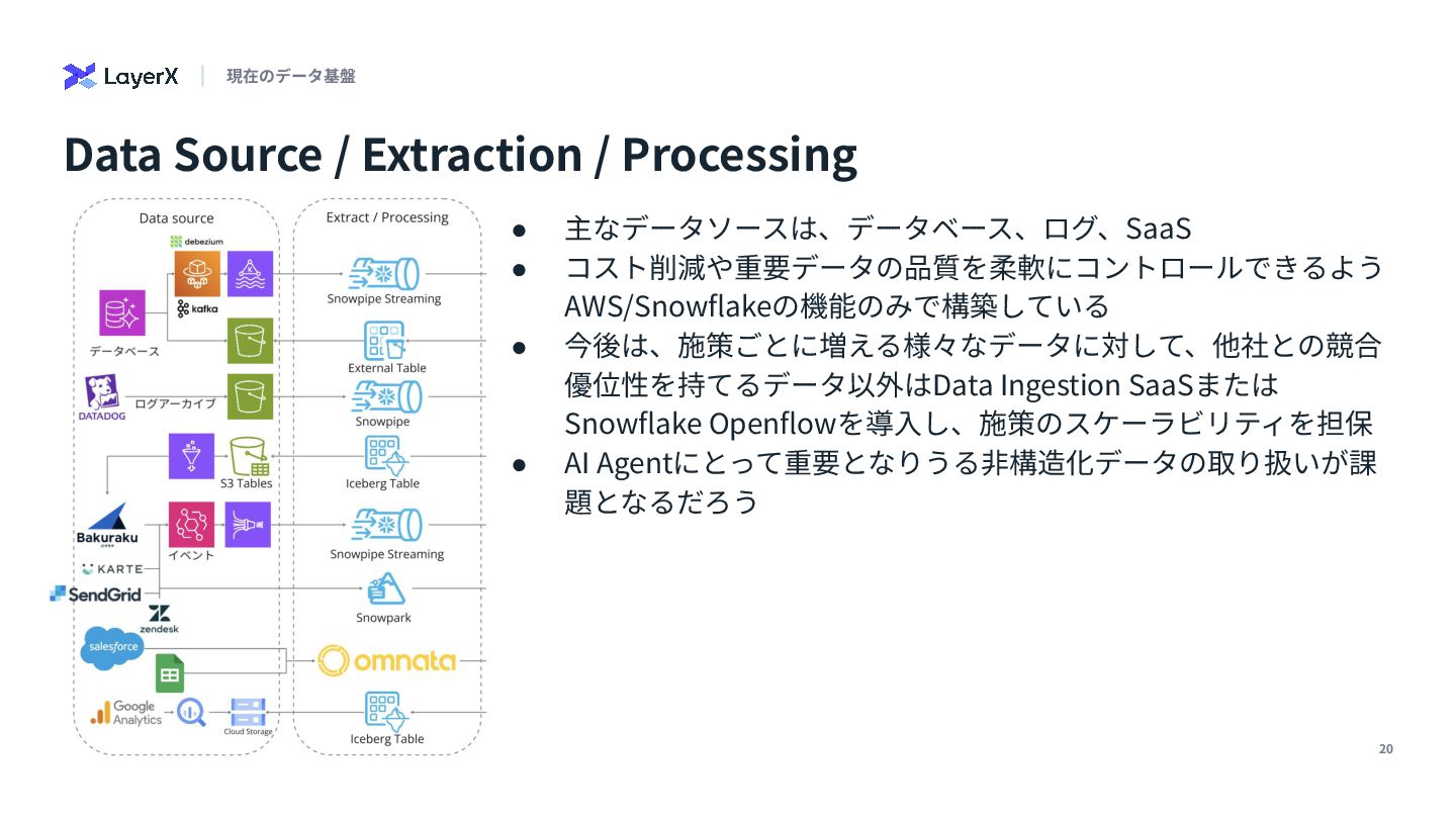 今後は、施策ごとに増える様々なデータに対して、他社との競合 優位性を持てるデータ以外はData Ingestion SaaSまたは Snowflake Openflowを導⼊し、施策のスケーラビリティを担保 • AI Agentにとって重要となりうる⾮構造化データの取り扱いが課 題となるだろう Data Source / Extraction / Processing 現在のデータ基盤