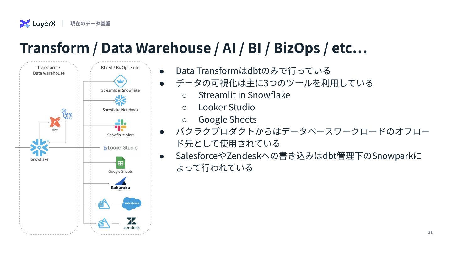 6. © LayerX Inc. 21 • Data Transformはdbtのみで⾏っている • データの可視化は主に3つのツールを利⽤している ◦