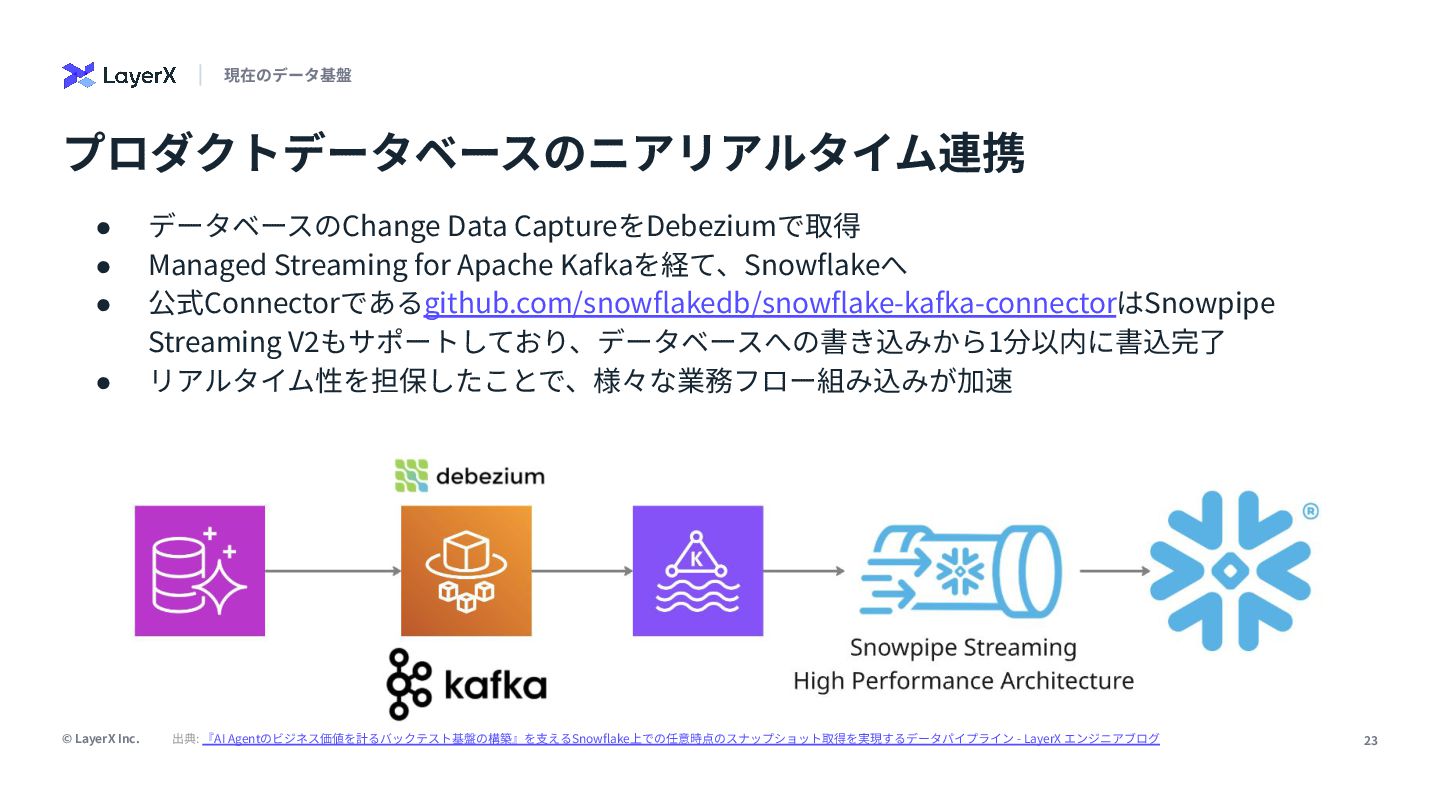 Streaming for Apache Kafkaを経て、Snowflakeへ • 公式Connectorであるgithub.com/snowflakedb/snowflake-kafka-connectorはSnowpipe Streaming V2もサポートしており、データベースへの書き込みから1分以内に書込完了 • リアルタイム性を担保したことで、様々な業務フロー組み込みが加速 プロダクトデータベースのニアリアルタイム連携 現在のデータ基盤 出典: 『AI Agentのビジネス価値を計るバックテスト基盤の構築』を⽀えるSnowflake上での任意時点のスナップショット取得を実現するデータパイプライン - LayerX エンジニアブログ