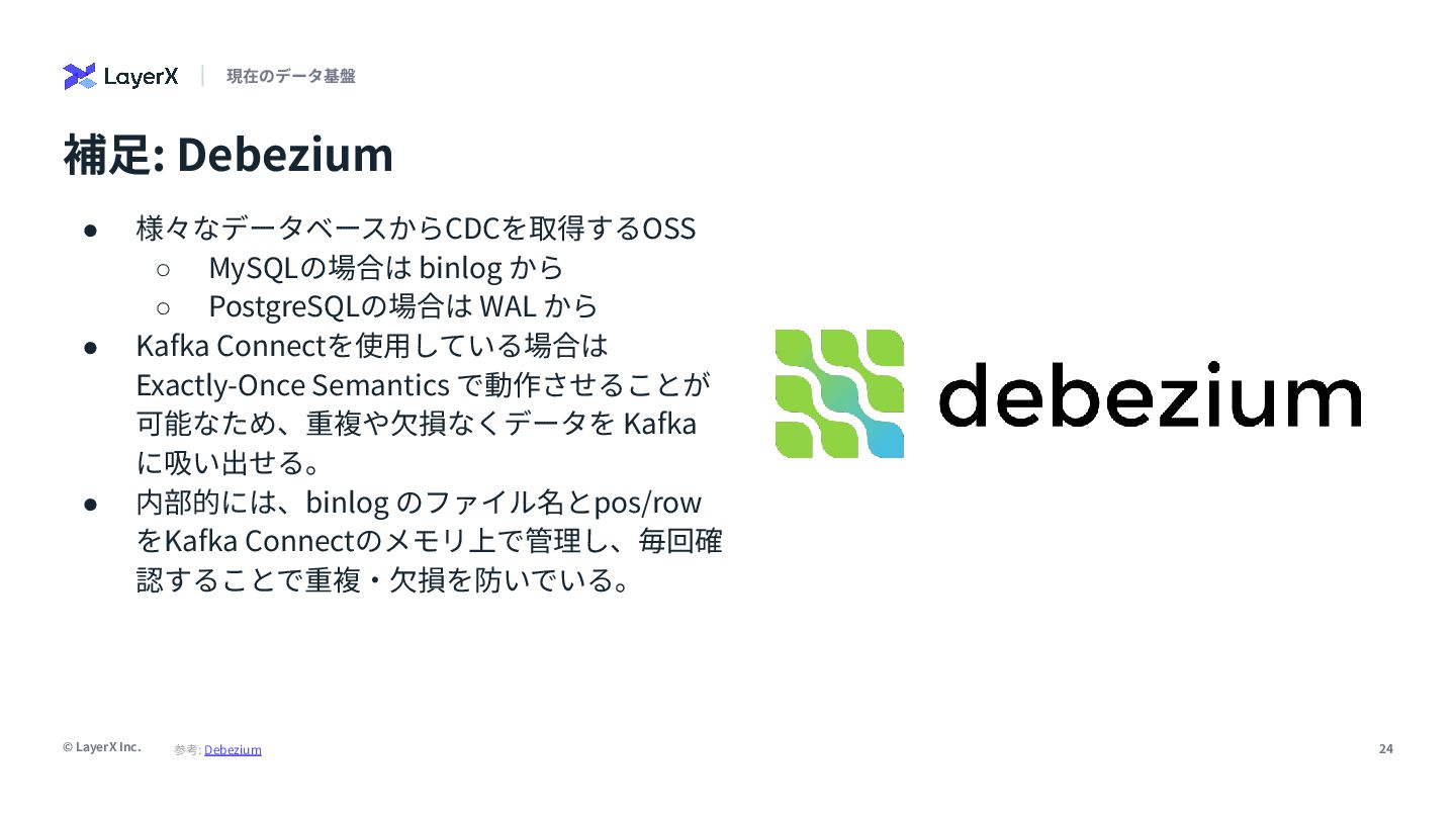 8. © LayerX Inc. 24 • 様々なデータベースからCDCを取得するOSS ◦ MySQLの場合は binlog から