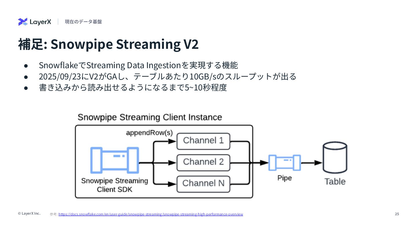 9. © LayerX Inc. 25 • SnowflakeでStreaming Data Ingestionを実現する機能 • 2025/09/23にV2がGAし、テーブルあたり10GB/sのスループットが出る