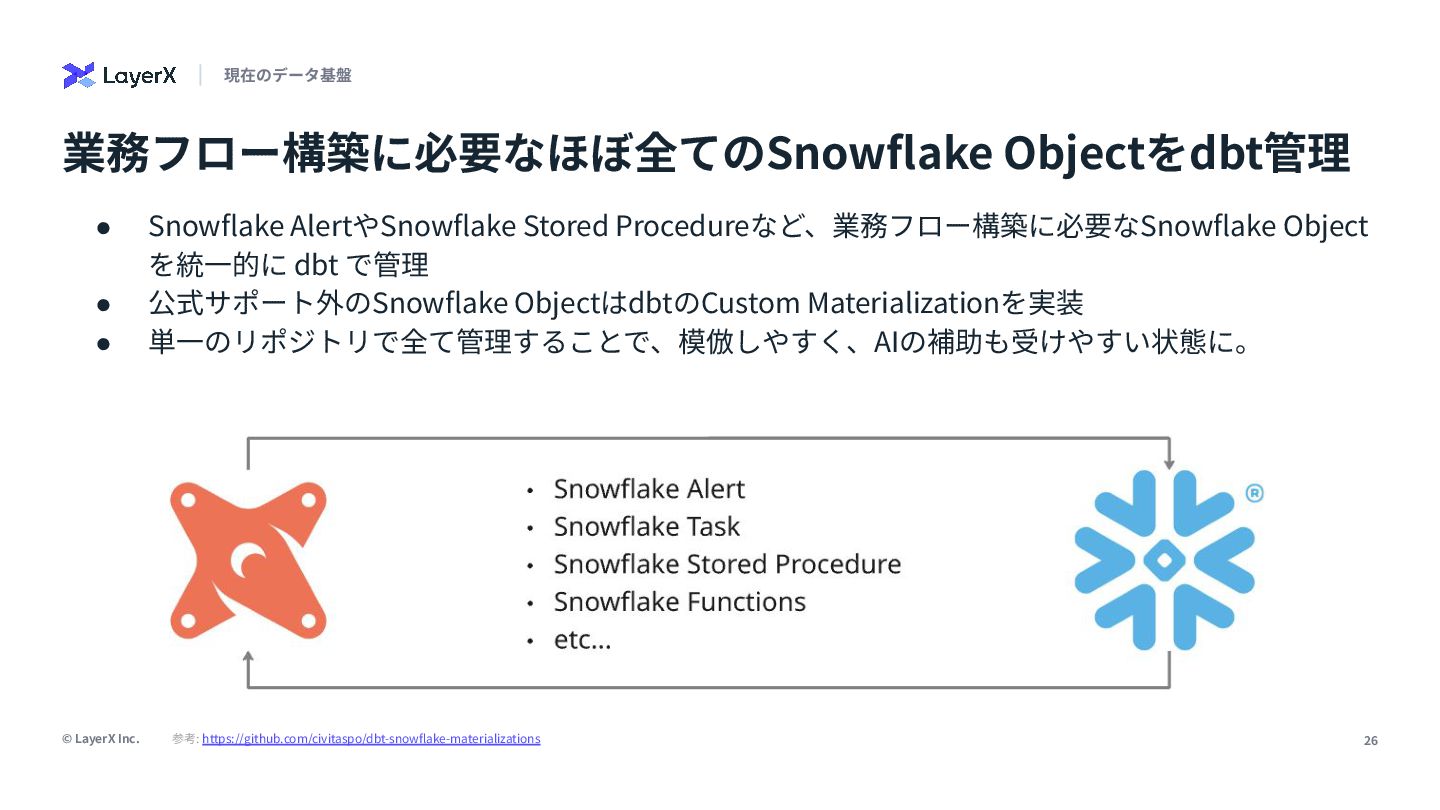 を統⼀的に dbt で管理 • 公式サポート外のSnowflake ObjectはdbtのCustom Materializationを実装 • 単⼀のリポジトリで全て管理することで、模倣しやすく、AIの補助も受けやすい状態に。 業務フロー構築に必要なほぼ全てのSnowflake Objectをdbt管理 現在のデータ基盤 参考: https://github.com/civitaspo/dbt-snowflake-materializations