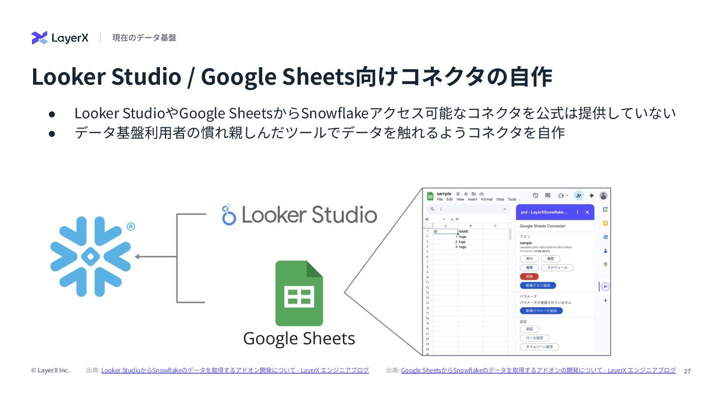 11. © LayerX Inc. 27 • Looker StudioやGoogle SheetsからSnowflakeアクセス可能なコネクタを公式は提供していない • データ基盤利⽤者の慣れ親しんだツールでデータを触れるようコネクタを⾃作