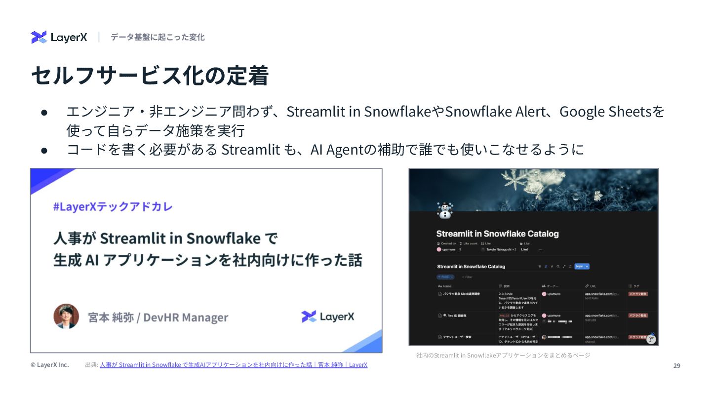 使って⾃らデータ施策を実⾏ • コードを書く必要がある Streamlit も、AI Agentの補助で誰でも使いこなせるように セルフサービス化の定着 データ基盤に起こった変化 出典: ⼈事が Streamlit in Snowflake で⽣成AIアプリケーションを社内向けに作った話|宮本 純弥|LayerX 社内のStreamlit in Snowflakeアプリケーションをまとめるページ