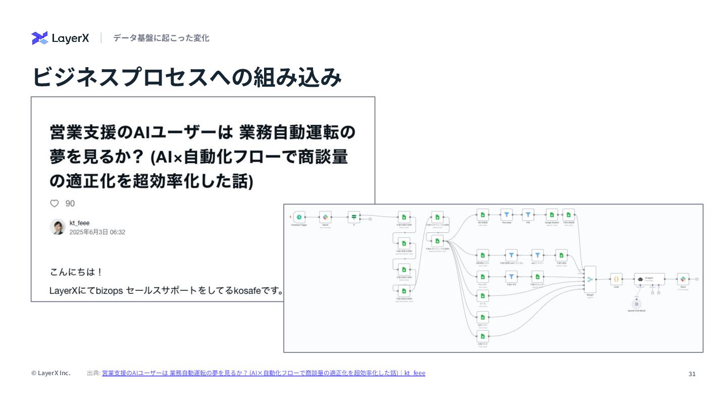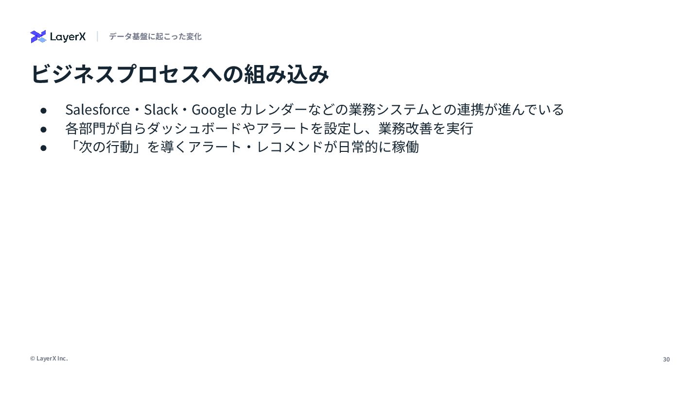13. © LayerX Inc. 30 • Salesforce‧Slack‧Google カレンダーなどの業務システムとの連携が進んでいる • 各部⾨が⾃らダッシュボードやアラートを設定し、業務改善を実⾏ •