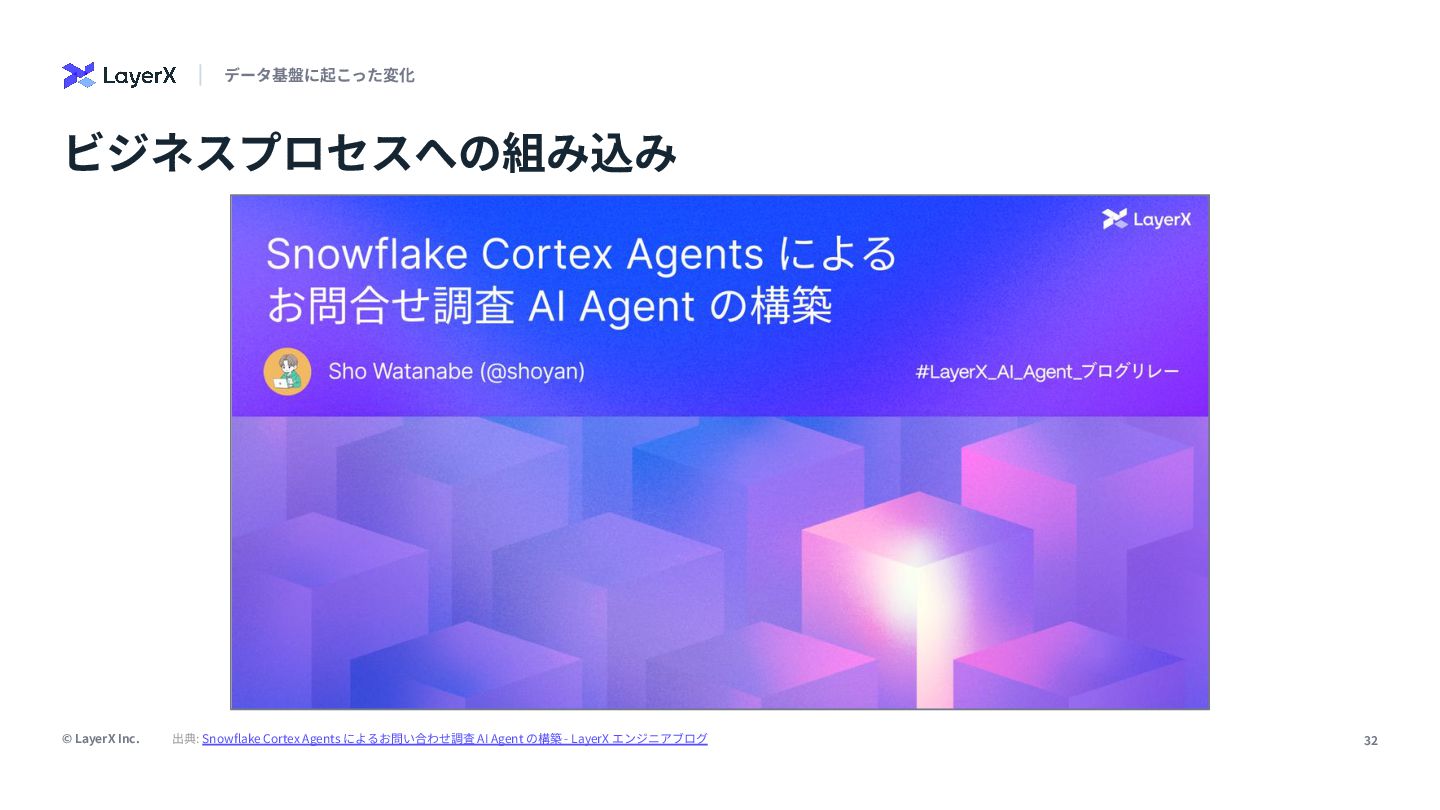 14. © LayerX Inc. 32 ビジネスプロセスへの組み込み データ基盤に起こった変化 出典: Snowflake Cortex Agents