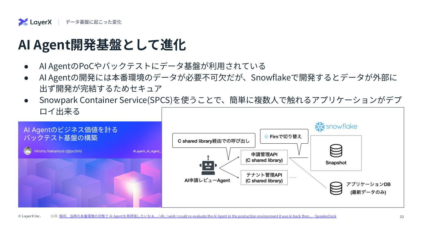 15. © LayerX Inc. 33 • AI AgentのPoCやバックテストにデータ基盤が利⽤されている • AI Agentの開発には本番環境のデータが必要不可⽋だが、Snowflakeで開発するとデータが外部に