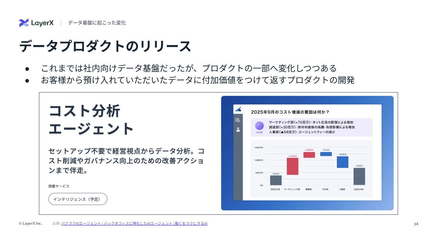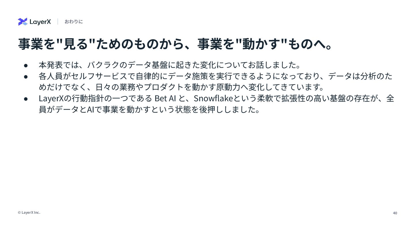 LayerXの⾏動指針の⼀つである Bet AI と、Snowflakeという柔軟で拡張性の⾼い基盤の存在が、全 員がデータとAIで事業を動かすという状態を後押ししました。 事業を"⾒る"ためのものから、事業を"動かす"ものへ。 おわりに