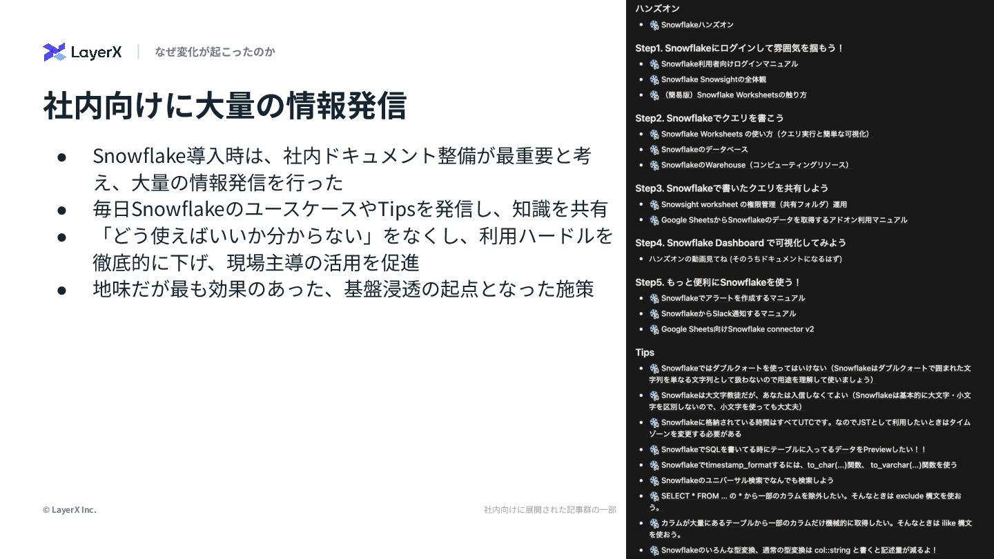 16. © LayerX Inc. 36 • Snowflake導⼊時は、社内ドキュメント整備が最重要と考 え、⼤量の情報発信を⾏った • 毎⽇SnowflakeのユースケースやTipsを発信し、知識を共有 •