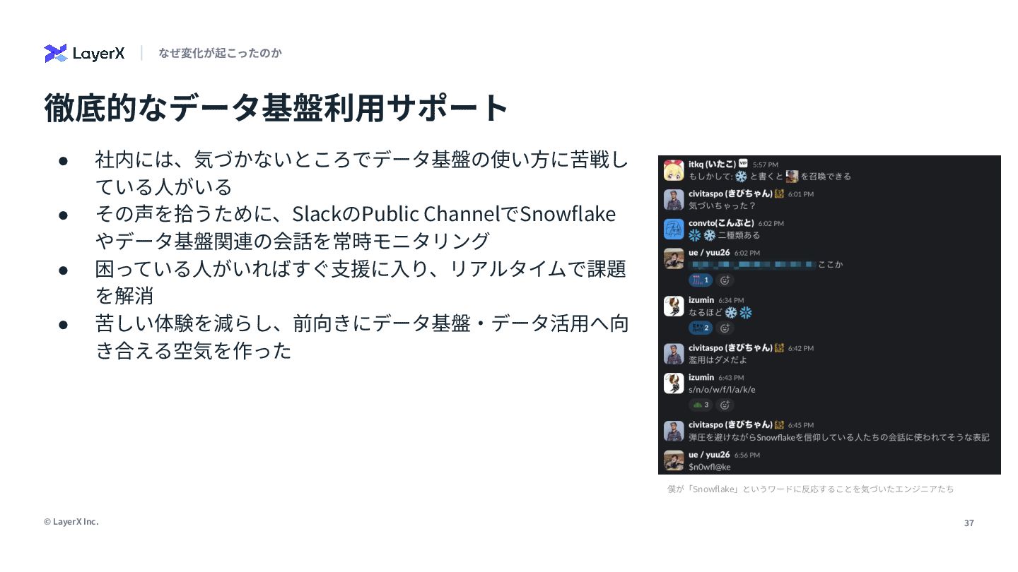 17. © LayerX Inc. 37 • 社内には、気づかないところでデータ基盤の使い⽅に苦戦し ている⼈がいる • その声を拾うために、SlackのPublic ChannelでSnowflake
