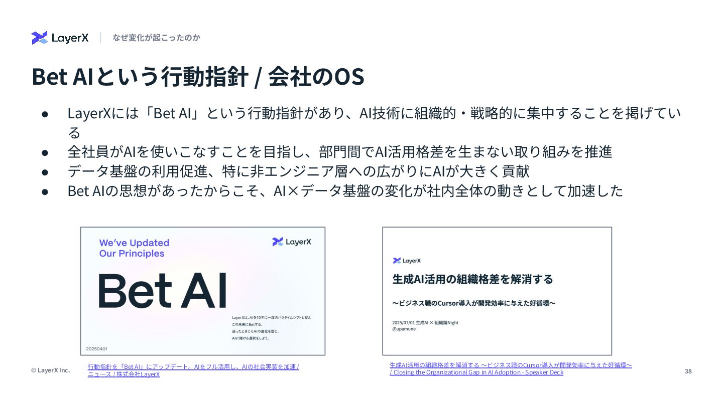• データ基盤の利⽤促進、特に⾮エンジニア層への広がりにAIが⼤きく貢献 • Bet AIの思想があったからこそ、AI×データ基盤の変化が社内全体の動きとして加速した Bet AIという⾏動指針 / 会社のOS なぜ変化が起こったのか ⾏動指針を「Bet AI」にアップデート。AIをフル活⽤し、AIの社会実装を加速 / ニュース / 株式会社LayerX ⽣成AI活⽤の組織格差を解消する 〜ビジネス職のCursor導⼊が開発効率に与えた好循環〜 / Closing the Organizational Gap in AI Adoption - Speaker Deck