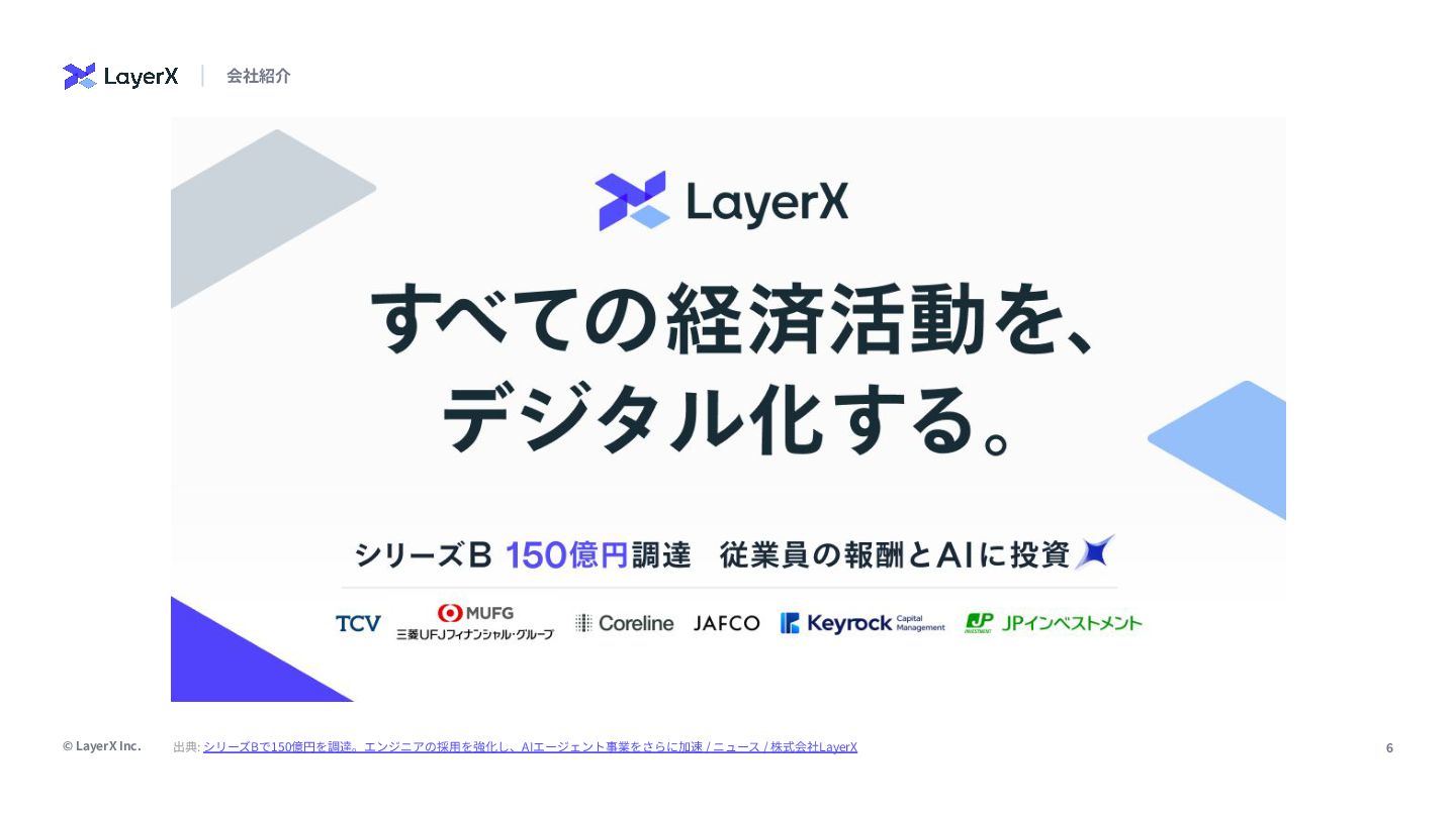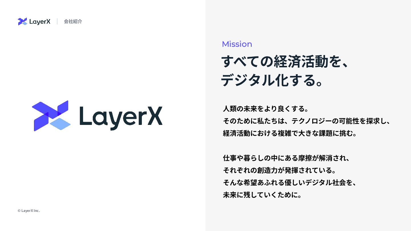 2. © LayerX Inc. 5 会社紹介 すべての経済活動を、 デジタル化する。 Mission ⼈類の未来をより良くする。 そのために私たちは、テクノロジーの可能性を探求し、