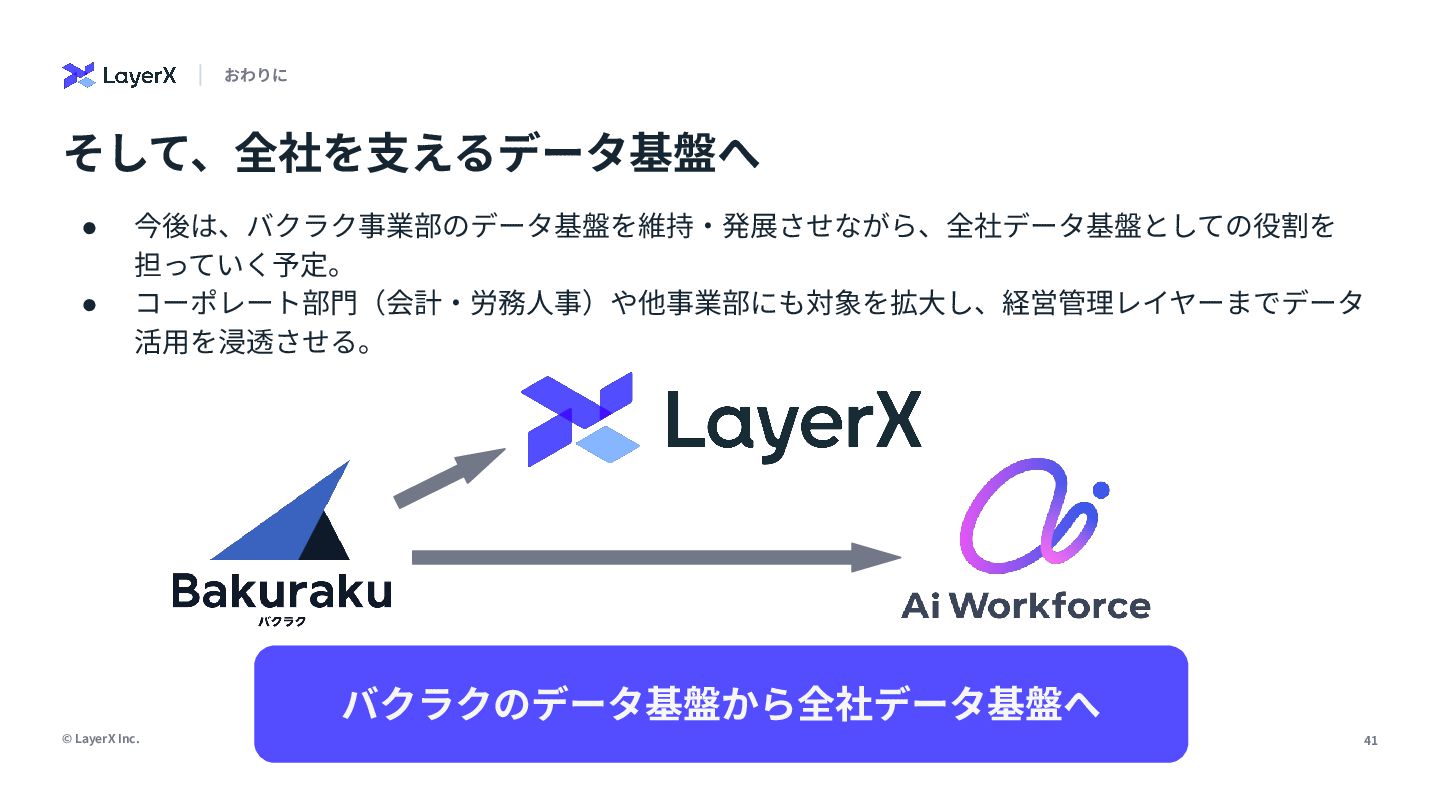 19. © LayerX Inc. 40 • 本発表では、バクラクのデータ基盤に起きた変化についてお話しました。 • 各⼈員がセルフサービスで⾃律的にデータ施策を実⾏できるようになっており、データは分析のた めだけでなく、⽇々の業務やプロダクトを動かす原動⼒へ変化してきています。 •