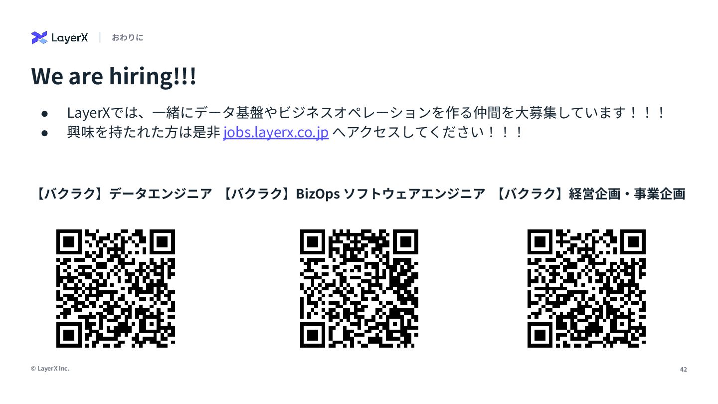 20. © LayerX Inc. 42 • LayerXでは、⼀緒にデータ基盤やビジネスオペレーションを作る仲間を⼤募集しています!!! • 興味を持たれた⽅は是⾮ jobs.layerx.co.jp へアクセスしてください!!!