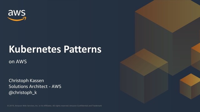 rights reserved. Amazon Confidential and Trademark – @christoph_k Storage architecture • Persistent Volume (PV) • Survives pod restarts • HostPath PV • Local storage PV • External storage systems • PVs are attached via PV claims • PV Claims (PVC) • Dynamic • Abstraction to underlying storage • ReadWriteOnce Pod Data Volume Pod (pvc) Persistent Vol Persistent Vol Pod (pvc) • Best resiliency • Low performance • No resiliency • Best performance • Medium resiliency • Best performance