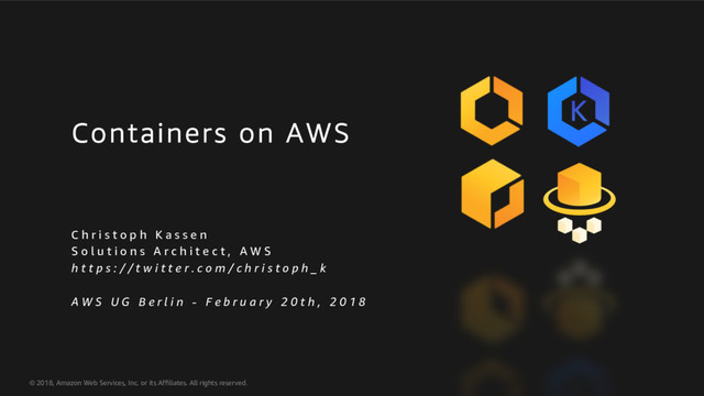 rights reserved. Containers on AWS C h r i s t o p h K a s s e n S o l u t i o n s A r c h i t e c t , A W S h t t p s : / / t w i t t e r . c o m / c h r i s t o p h _ k A W S U G B e r l i n - F e b r u a r y 2 0 t h , 2 0 1 8
