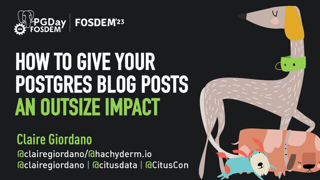 Slides from a talk presented in the PostgreSQL devroom at FOSDEM 2023. Talk description: One of the sayings about development in the Postgres world is “it’s not just open source, it’s open engineering.” In the spirit of openness, this talk will show you how to increase the impact and the reach of your Postgres blog posts. These best practices begin with empathy for your readers—and cover lots of ground from there, including key things to know about SEO, as well as tips on how to promote your blog post. This talk is not just theory: real-world examples are included throughout the talk.
