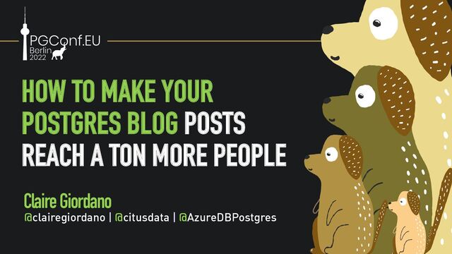 Slides from Claire Giordano’s talk at PGConf EU 2022 in Berlin, where she presented on how to make your Postgres blog posts reach a ton more people. One of the sayings about development in the Postgres world is “it’s not just open source, it’s open engineering.” In the spirit of openness, this talk walks you through a set of things you can do to make your Postgres blog posts reach a lot more people. These best practices begin with empathy for your readers—and cover lots of ground from there, including key things to know about SEO (search engine optimization) as well as tips on how to promote your blog post. This brand new talk isn’t just theory either: real-world examples are included throughout the talk.