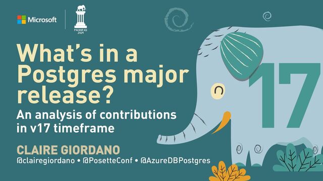 In this talk, you’ll walk through a brand new analysis—done by Postgres committer Daniel Gustafsson and Claire Giordano—of the contributions to Postgres in the v17 timeframe. The analysis will build on published blog posts such as the one Robert Haas publishes annually—and will leverage data sources such as the Postgres commit logs—and info about conference contributions, user groups, podcasts, and more. And there will be fun insights too, such as, what was the oldest piece of code that was replaced in PG 17?