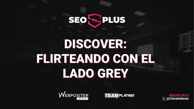 Ponencia titulada "Discover: Flirteando con el lado grey" de Clara Soteras en el evento SEOPLUS 2023 el 28 de julio en Alicante, con algunas claves para posicionar en Google Discover.