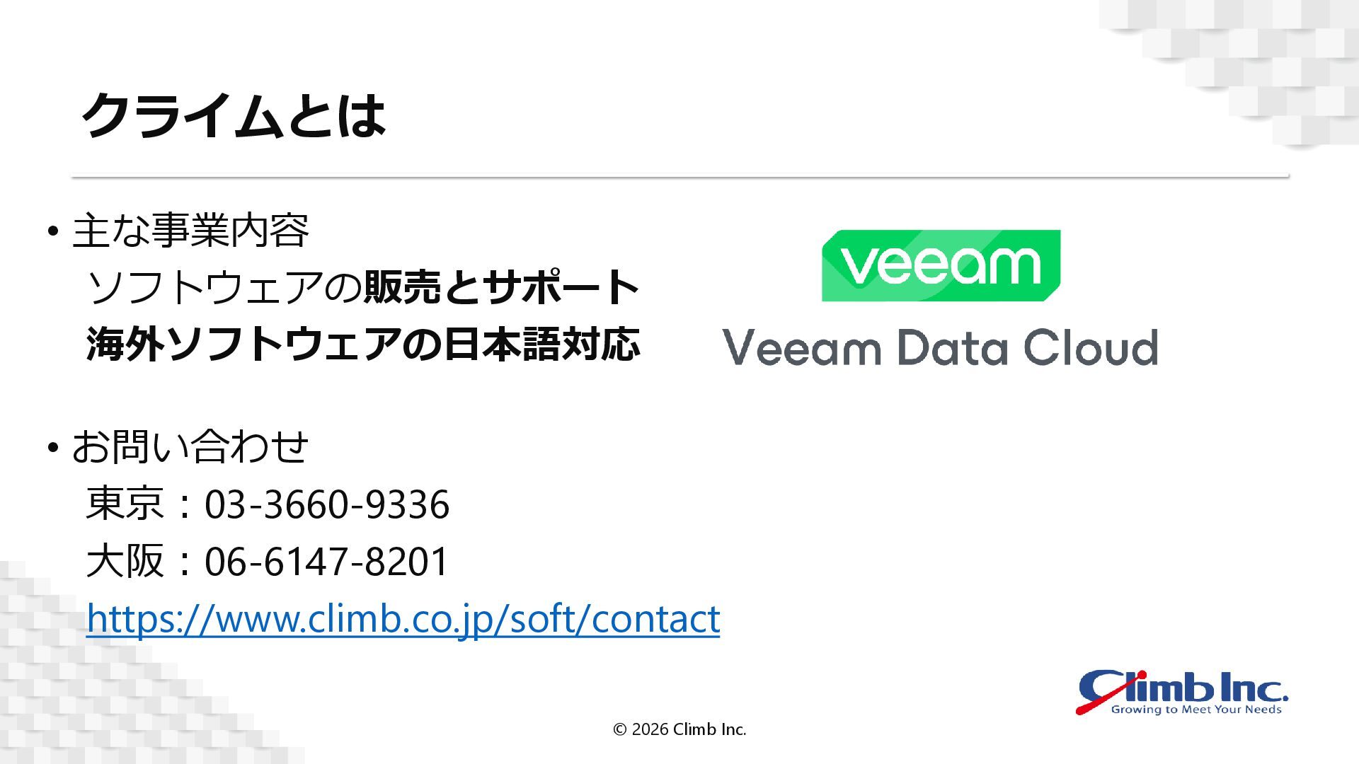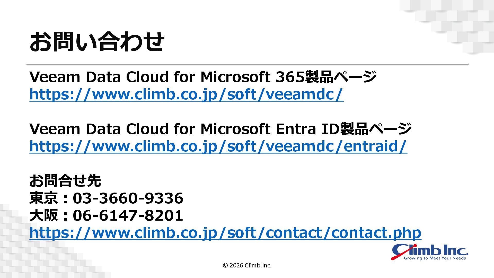 Cloud for Microsoft Entra ID製品ページ https://www.climb.co.jp/soft/veeamdc/entraid/ お問合せ先 東京:03-3660-9336 大阪:06-6147-8201 https://www.climb.co.jp/soft/contact/contact.php © 2026 Climb Inc.