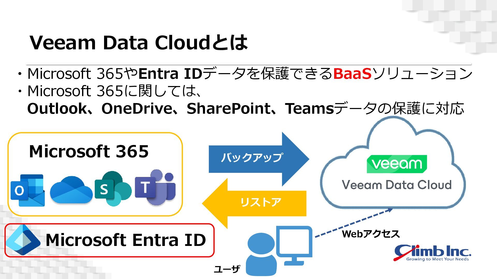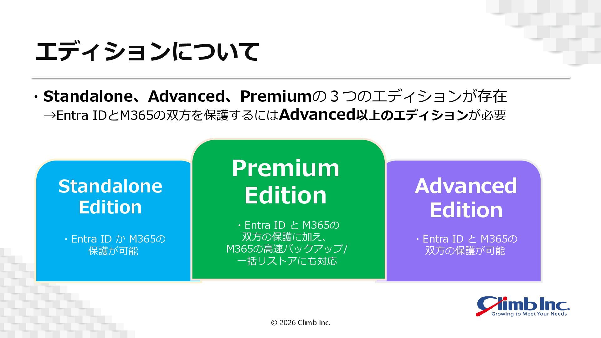 M365の 保護が可能 ・Entra ID と M365の 双方の保護が可能 ・Entra ID と M365の 双方の保護に加え、 M365の高速バックアップ/ 一括リストアにも対応 ・Standalone、Advanced、Premiumの3つのエディションが存在 →Entra IDとM365の双方を保護するにはAdvanced以上のエディションが必要 © 2026 Climb Inc.