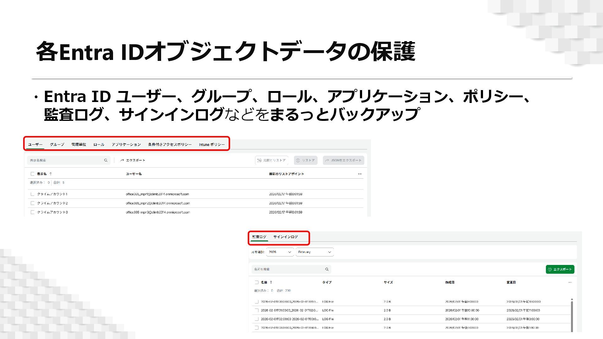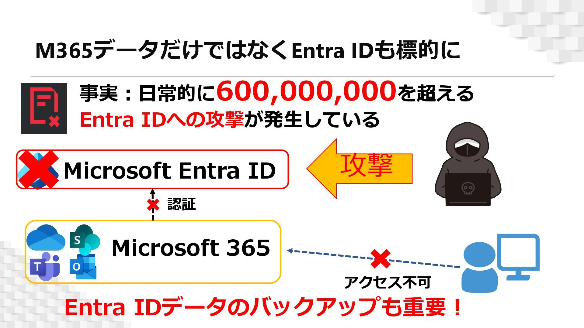 昨今では、1日当たり6億件を超えるEntra IDへの攻撃が発生しているといわれ、これらのサイバー攻撃や設定ミスなどによりEntra IDデータに問題が発生した場合、各Microsoft 365コンテンツへのアクセスもできなくなってしまうためです。