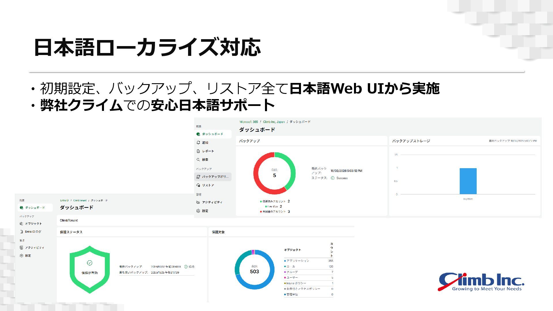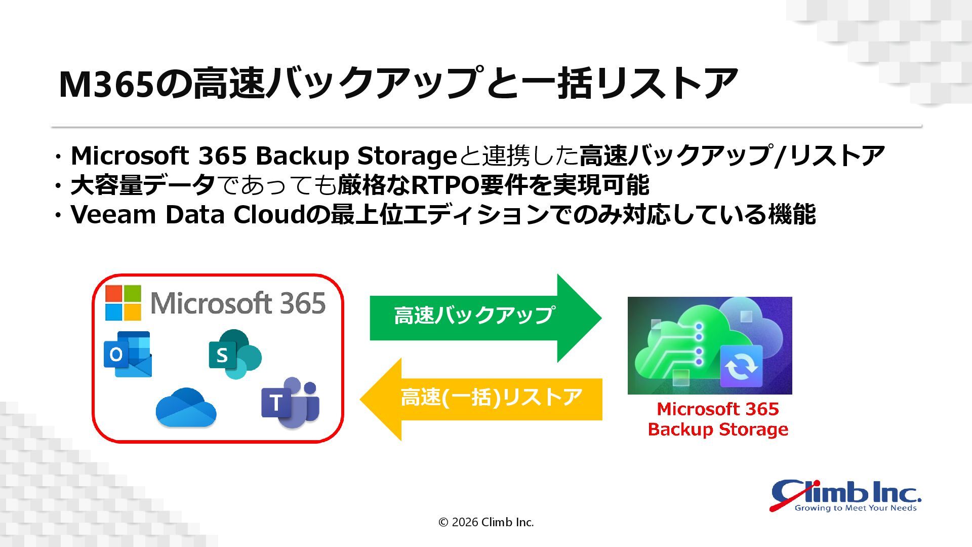 ・世代保持ポリシーによる堅牢なセキュリティストレージへの保護 →サイバー攻撃への対策、意図せぬ削除への対応やコンプライアンス要件も順守 ・高速バックアップやオブジェクト単位での柔軟なリストア →大規模環境への対応、復旧したいデータのみを迅速に復旧 © 2026 Climb Inc.