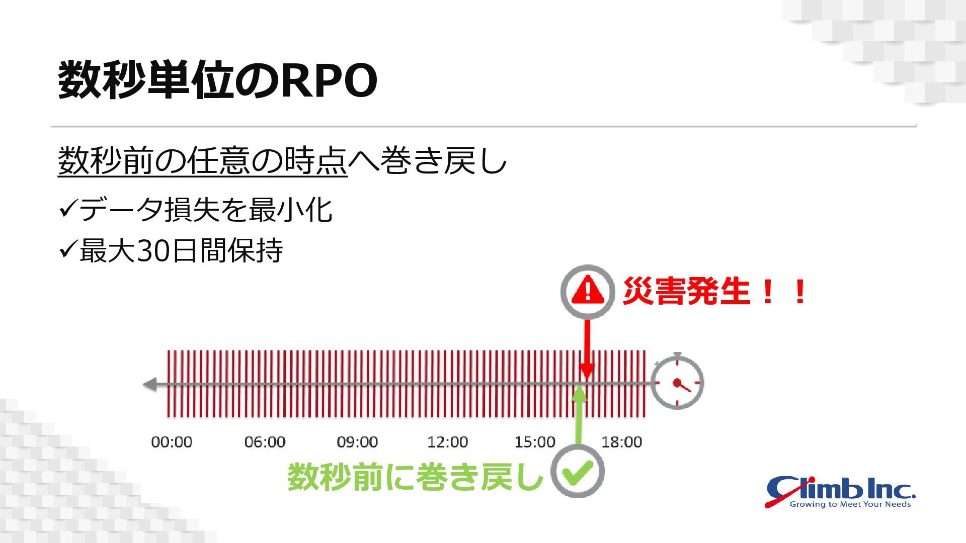 そのため、データ損失の時間を最小限に抑え、障害や災害によるシステム運用への影響を大幅に削減します。
