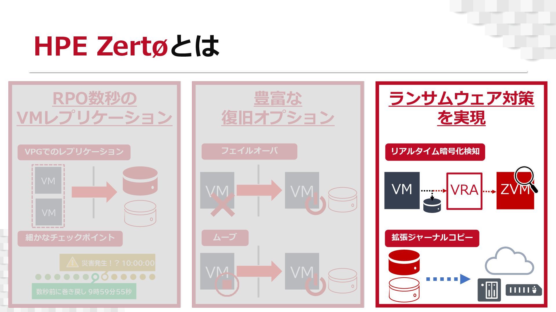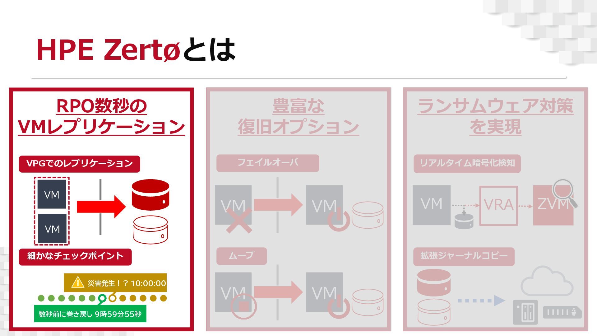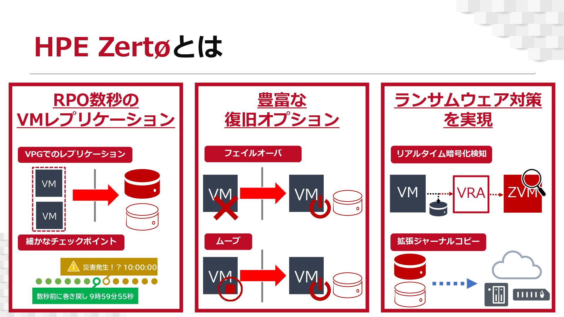 本セミナーでは、「HPE Zerto」の基本的なアーキテクチャや主要機能を、デモを交えながらご紹介いたします。