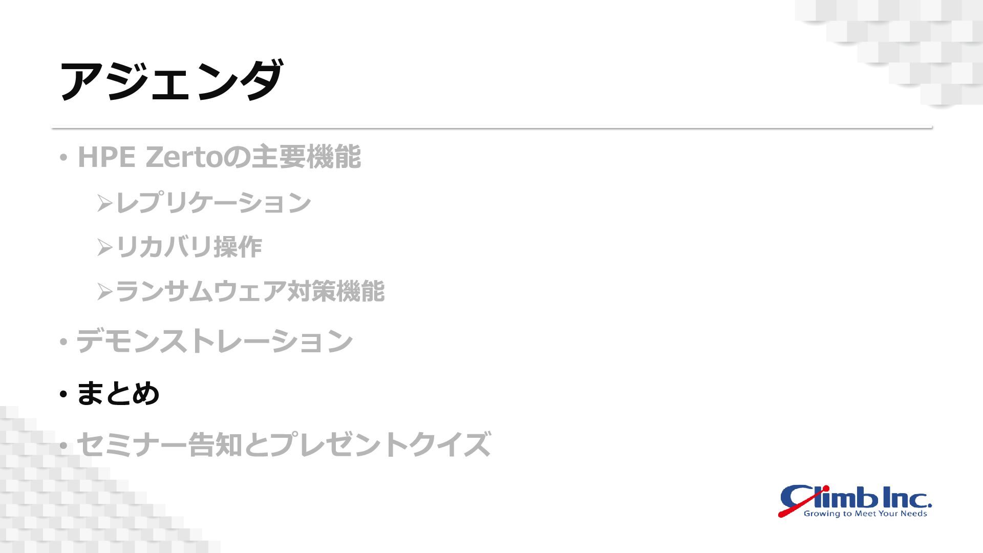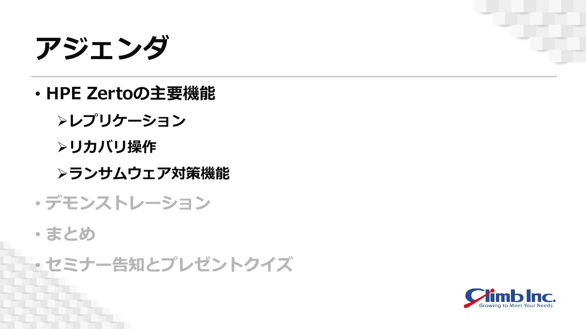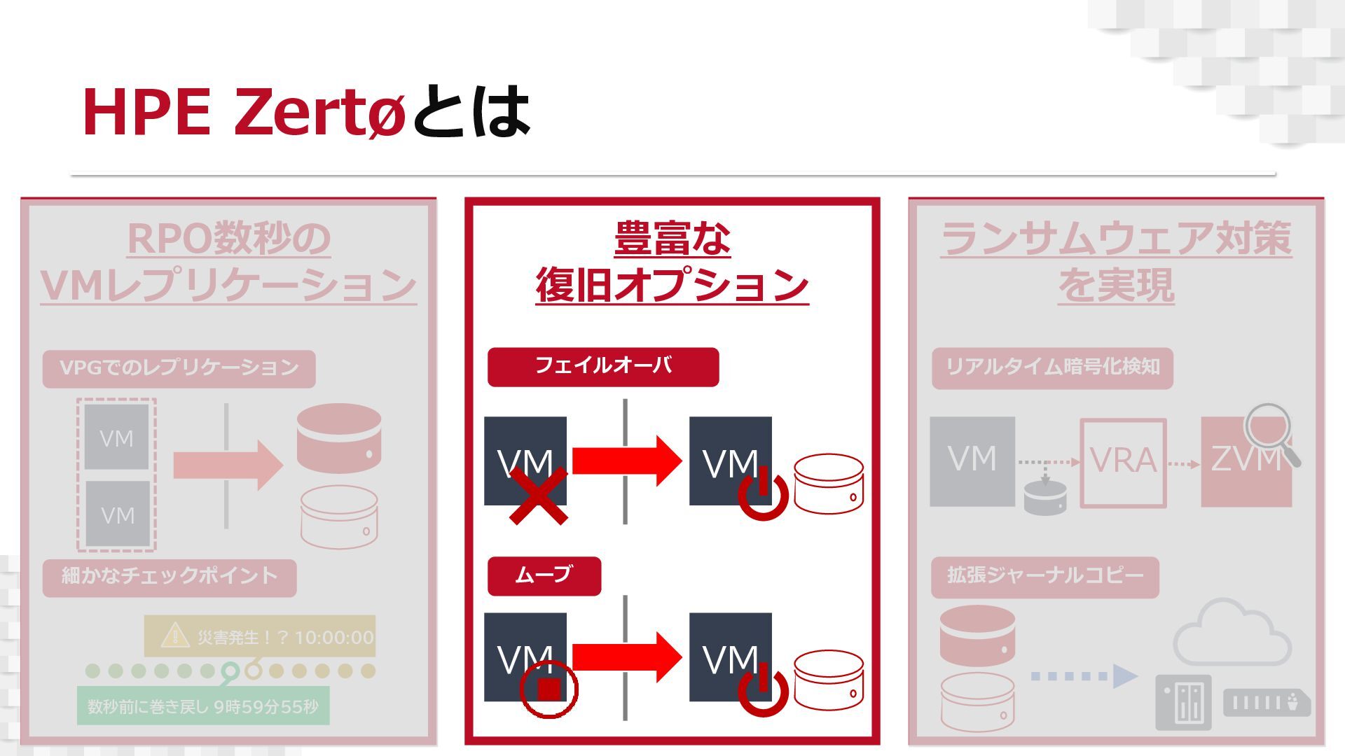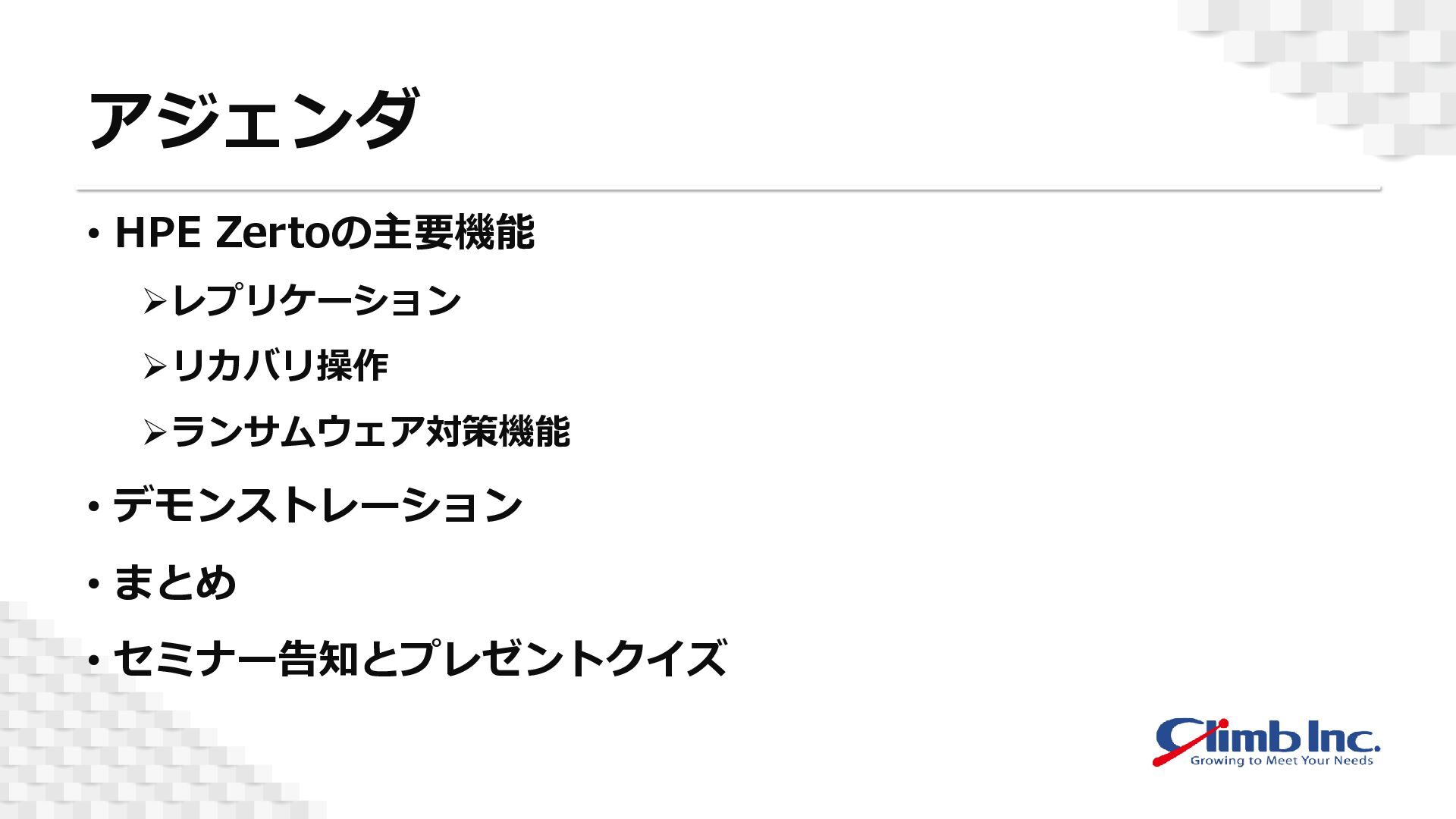 本セミナーでは、「HPE Zerto」の基本的なアーキテクチャや主要機能を、デモを交えながらご紹介いたします。