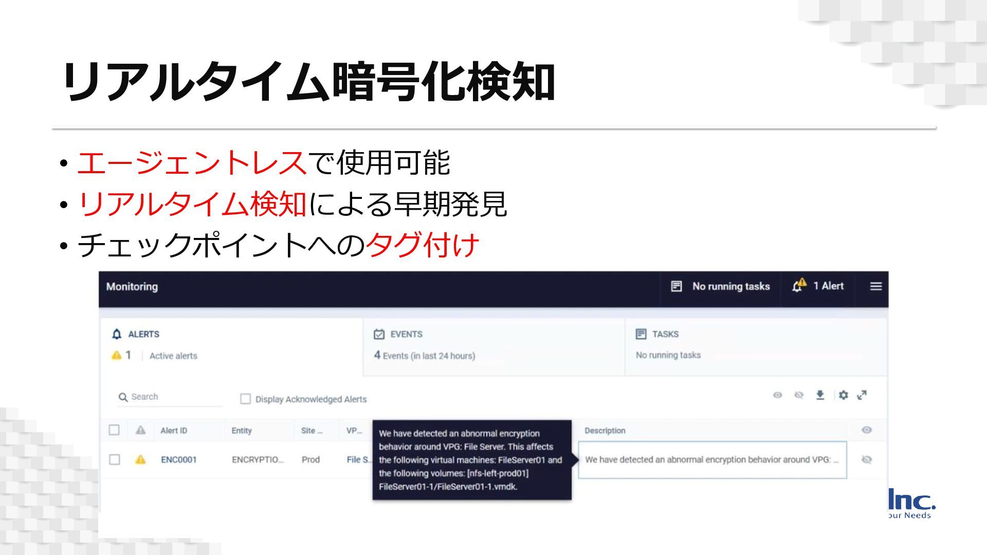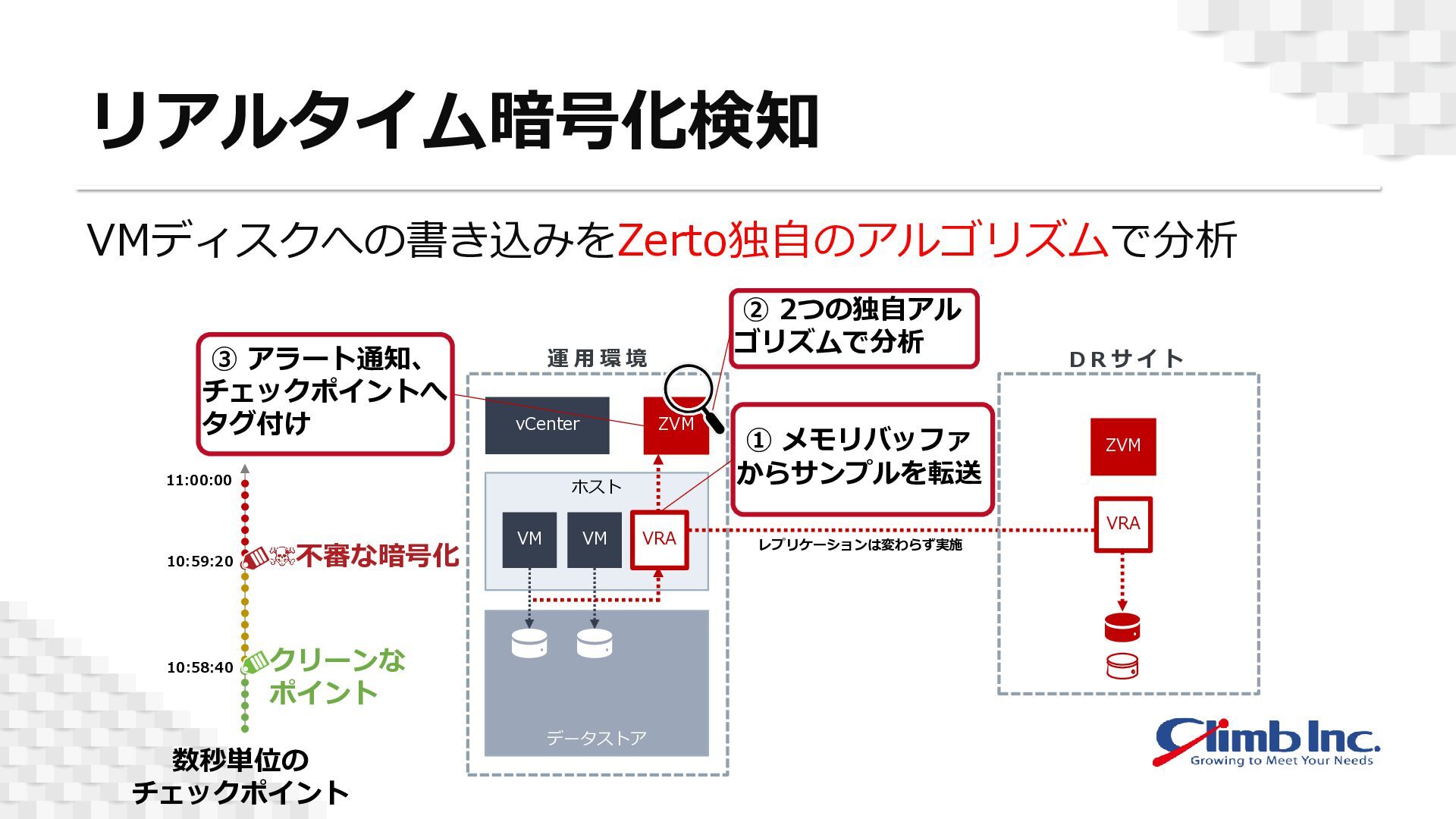 また、Zerto独自のアルゴリズムによるリアルタイムな暗号化検知機能が実装されているため、