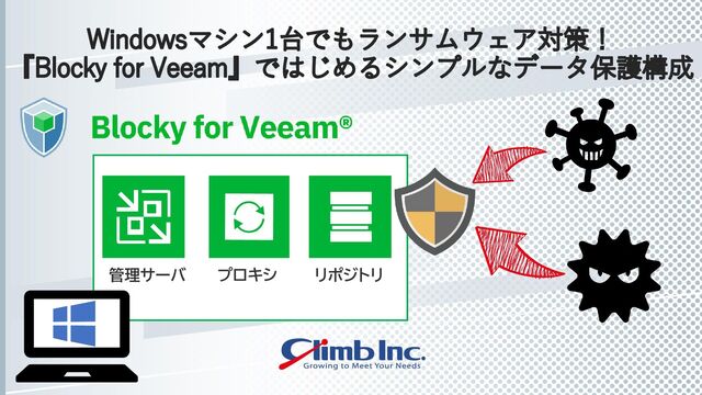 Blockyなら、インストールが簡単で、VeeamがインストールされたWindowsマシン1台のスモール環境であってもランサムウェア対策を実現できます。