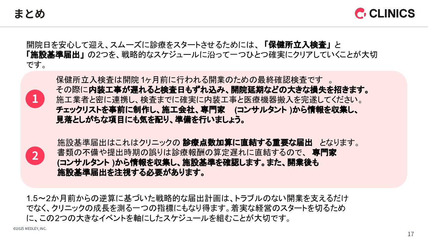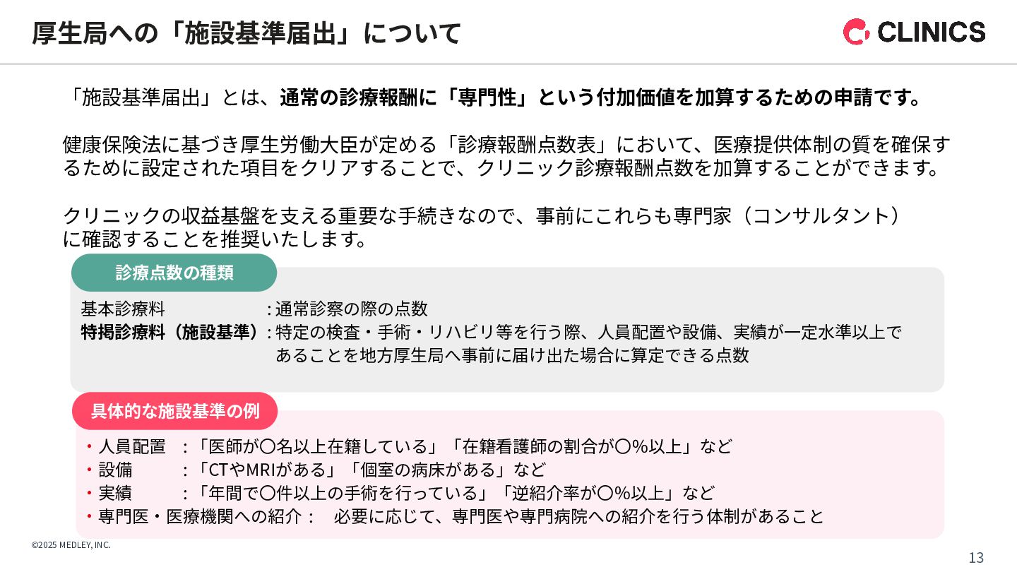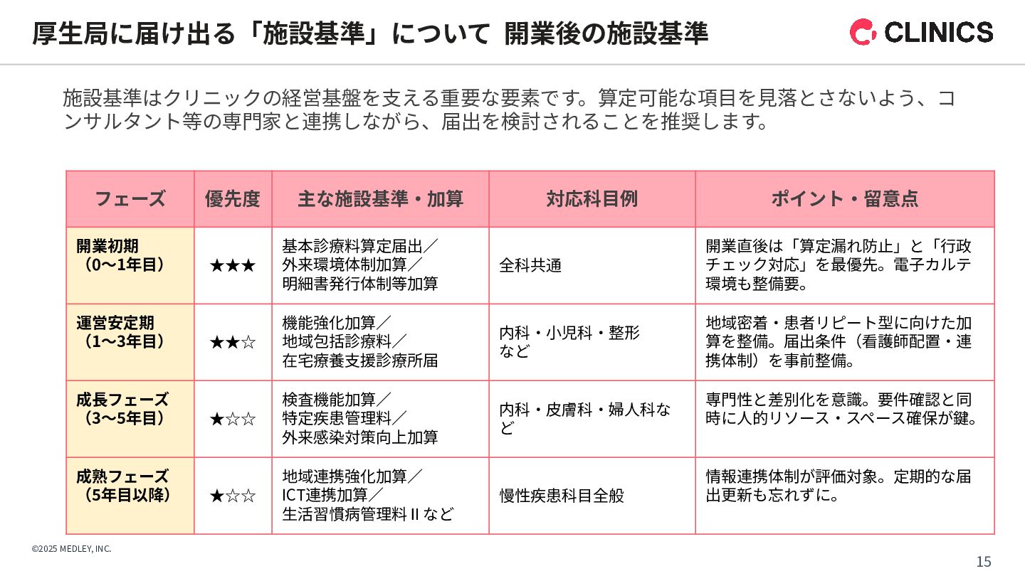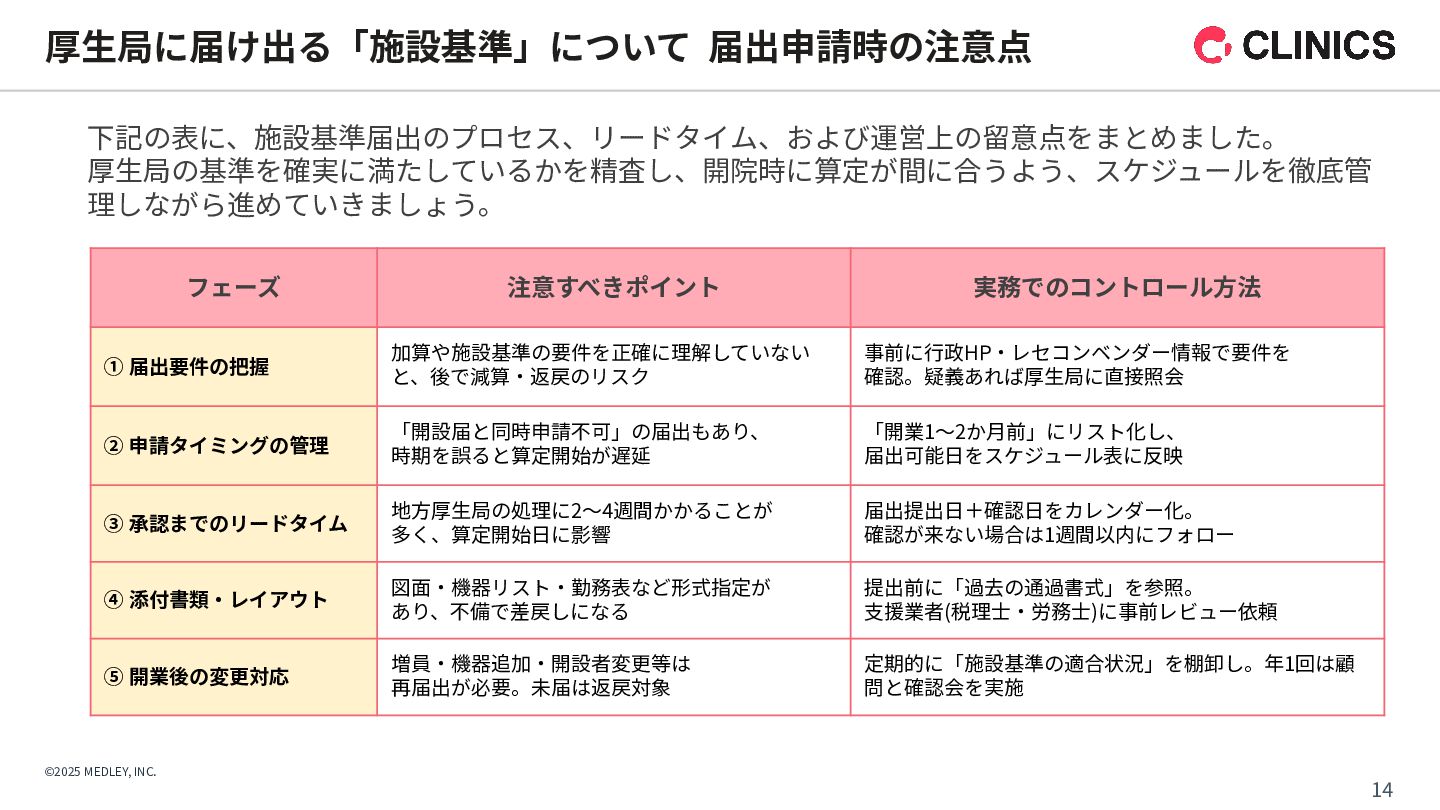 届出要件の把握 加算や施設基準の要件を正確に理解していない と、後で減算‧返戻のリスク 事前に⾏政HP‧レセコンベンダー情報で要件を 確認。疑義あれば厚⽣局に直接照会 ② 申請タイミングの管理 「開設届と同時申請不可」の届出もあり、 時期を誤ると算定開始が遅延 「開業1〜2か⽉前」にリスト化し、 届出可能⽇をスケジュール表に反映 ③ 承認までのリードタイム 地⽅厚⽣局の処理に2〜4週間かかることが 多く、算定開始⽇に影響 届出提出⽇+確認⽇をカレンダー化。 確認が来ない場合は1週間以内にフォロー ④ 添付書類‧レイアウト 図⾯‧機器リスト‧勤務表など形式指定が あり、不備で差戻しになる 提出前に「過去の通過書式」を参照。 ⽀援業者(税理⼠‧労務⼠)に事前レビュー依頼 ⑤ 開業後の変更対応 増員‧機器追加‧開設者変更等は 再届出が必要。未届は返戻対象 定期的に「施設基準の適合状況」を棚卸し。年1回は顧 問と確認会を実施 下記の表に、施設基準届出のプロセス、リードタイム、および運営上の留意点をまとめました。 厚⽣局の基準を確実に満たしているかを精査し、開院時に算定が間に合うよう、スケジュールを徹底管 理しながら進めていきましょう。