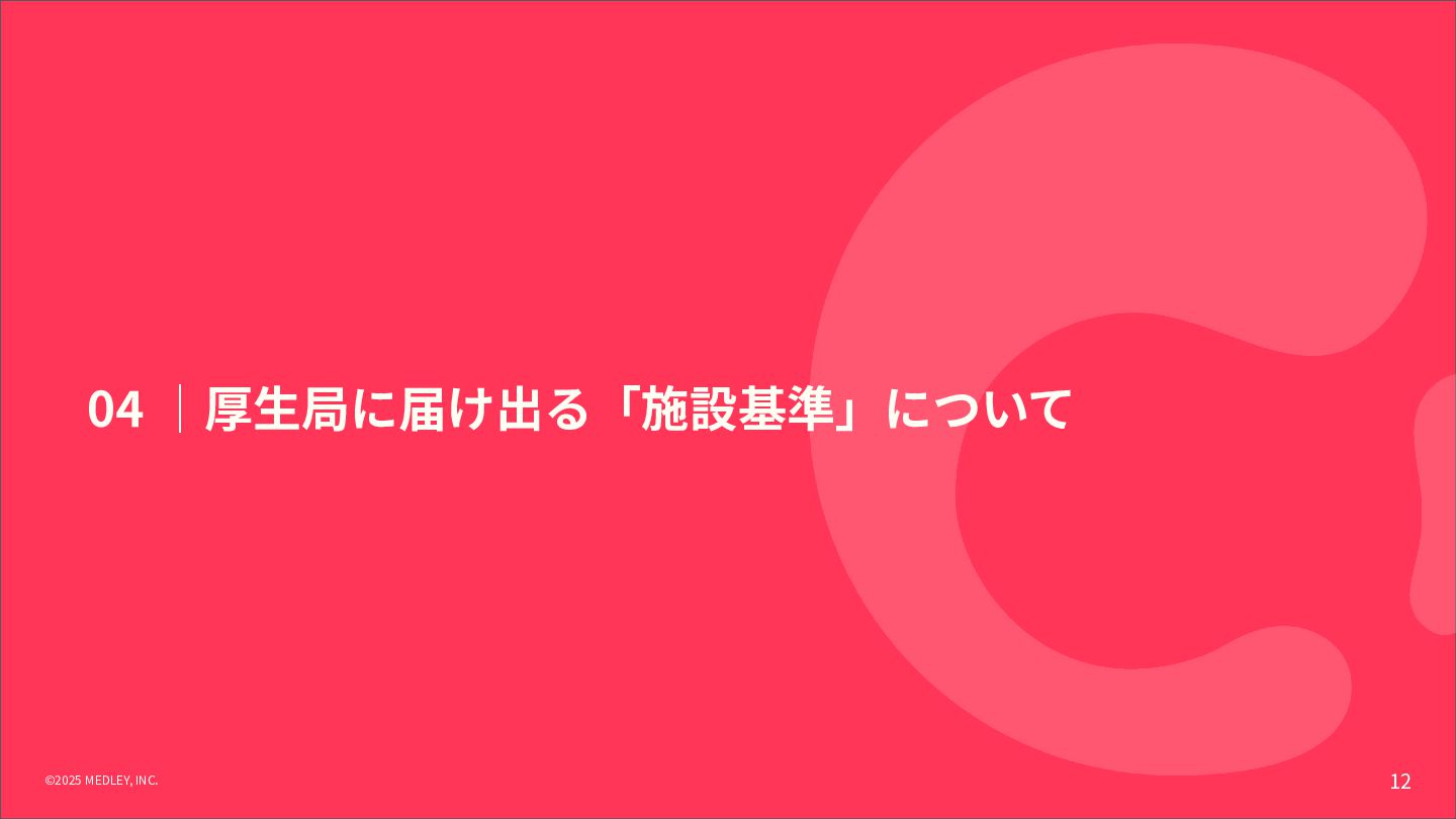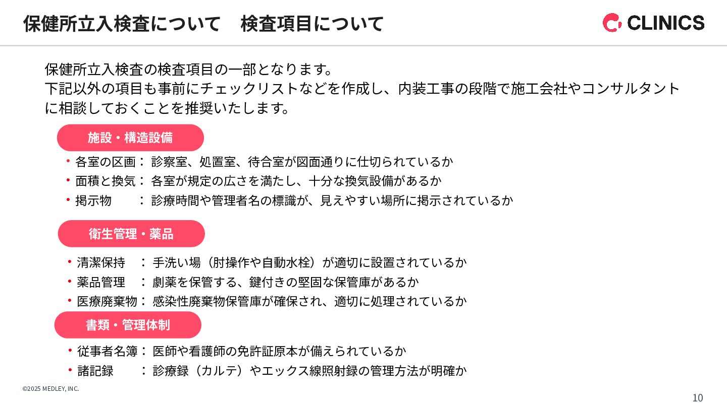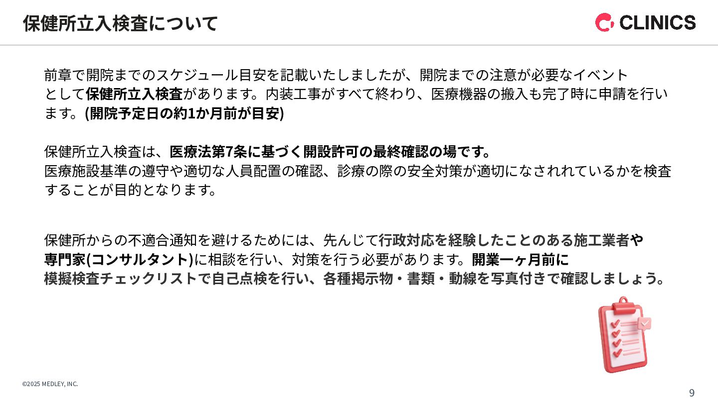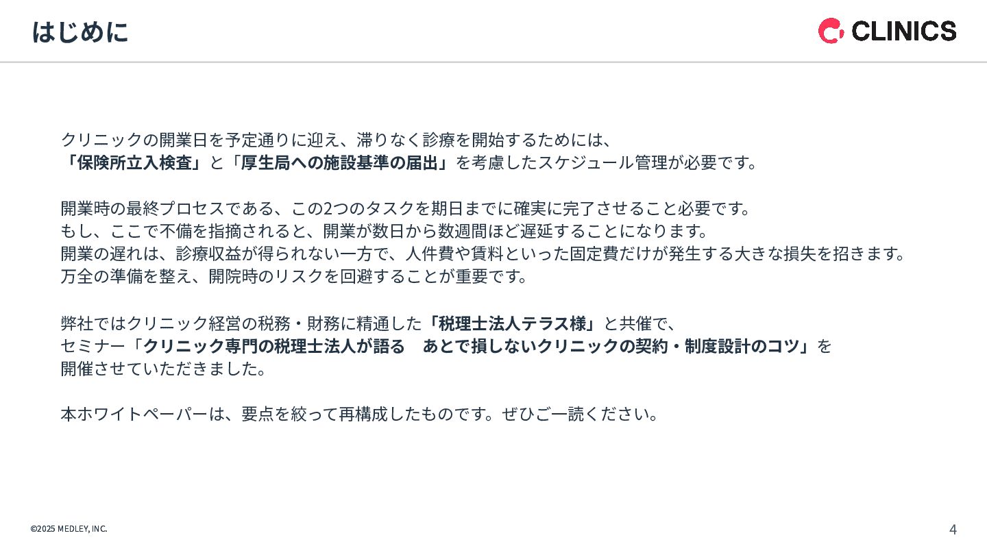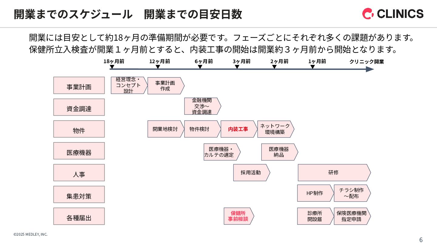 届出要件の把握 加算や施設基準の要件を正確に理解していない と、後で減算‧返戻のリスク 事前に⾏政HP‧レセコンベンダー情報で要件を 確認。疑義あれば厚⽣局に直接照会 ② 申請タイミングの管理 「開設届と同時申請不可」の届出もあり、 時期を誤ると算定開始が遅延 「開業1〜2か⽉前」にリスト化し、 届出可能⽇をスケジュール表に反映 ③ 承認までのリードタイム 地⽅厚⽣局の処理に2〜4週間かかることが 多く、算定開始⽇に影響 届出提出⽇+確認⽇をカレンダー化。 確認が来ない場合は1週間以内にフォロー ④ 添付書類‧レイアウト 図⾯‧機器リスト‧勤務表など形式指定が あり、不備で差戻しになる 提出前に「過去の通過書式」を参照。 ⽀援業者(税理⼠‧労務⼠)に事前レビュー依頼 ⑤ 開業後の変更対応 増員‧機器追加‧開設者変更等は 再届出が必要。未届は返戻対象 定期的に「施設基準の適合状況」を棚卸し。年1回は顧 問と確認会を実施 下記の表に、施設基準届出のプロセス、リードタイム、および運営上の留意点をまとめました。 厚⽣局の基準を確実に満たしているかを精査し、開院時に算定が間に合うよう、スケジュールを徹底管 理しながら進めていきましょう。