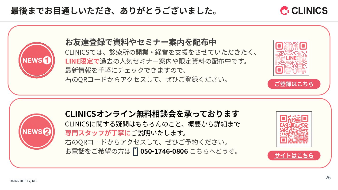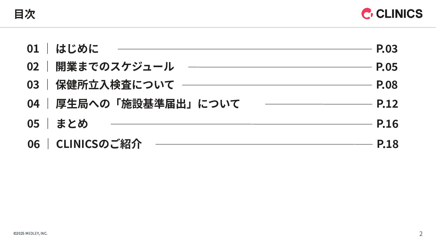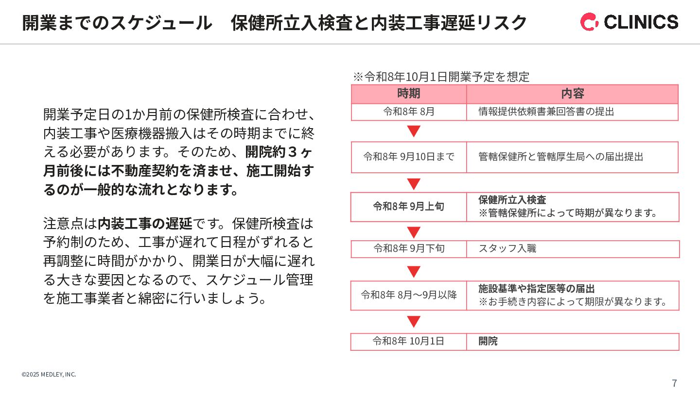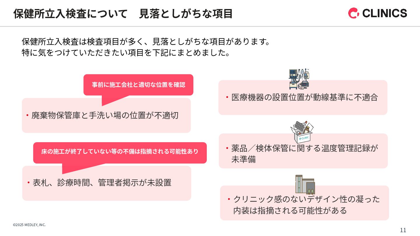 届出要件の把握 加算や施設基準の要件を正確に理解していない と、後で減算‧返戻のリスク 事前に⾏政HP‧レセコンベンダー情報で要件を 確認。疑義あれば厚⽣局に直接照会 ② 申請タイミングの管理 「開設届と同時申請不可」の届出もあり、 時期を誤ると算定開始が遅延 「開業1〜2か⽉前」にリスト化し、 届出可能⽇をスケジュール表に反映 ③ 承認までのリードタイム 地⽅厚⽣局の処理に2〜4週間かかることが 多く、算定開始⽇に影響 届出提出⽇+確認⽇をカレンダー化。 確認が来ない場合は1週間以内にフォロー ④ 添付書類‧レイアウト 図⾯‧機器リスト‧勤務表など形式指定が あり、不備で差戻しになる 提出前に「過去の通過書式」を参照。 ⽀援業者(税理⼠‧労務⼠)に事前レビュー依頼 ⑤ 開業後の変更対応 増員‧機器追加‧開設者変更等は 再届出が必要。未届は返戻対象 定期的に「施設基準の適合状況」を棚卸し。年1回は顧 問と確認会を実施 下記の表に、施設基準届出のプロセス、リードタイム、および運営上の留意点をまとめました。 厚⽣局の基準を確実に満たしているかを精査し、開院時に算定が間に合うよう、スケジュールを徹底管 理しながら進めていきましょう。